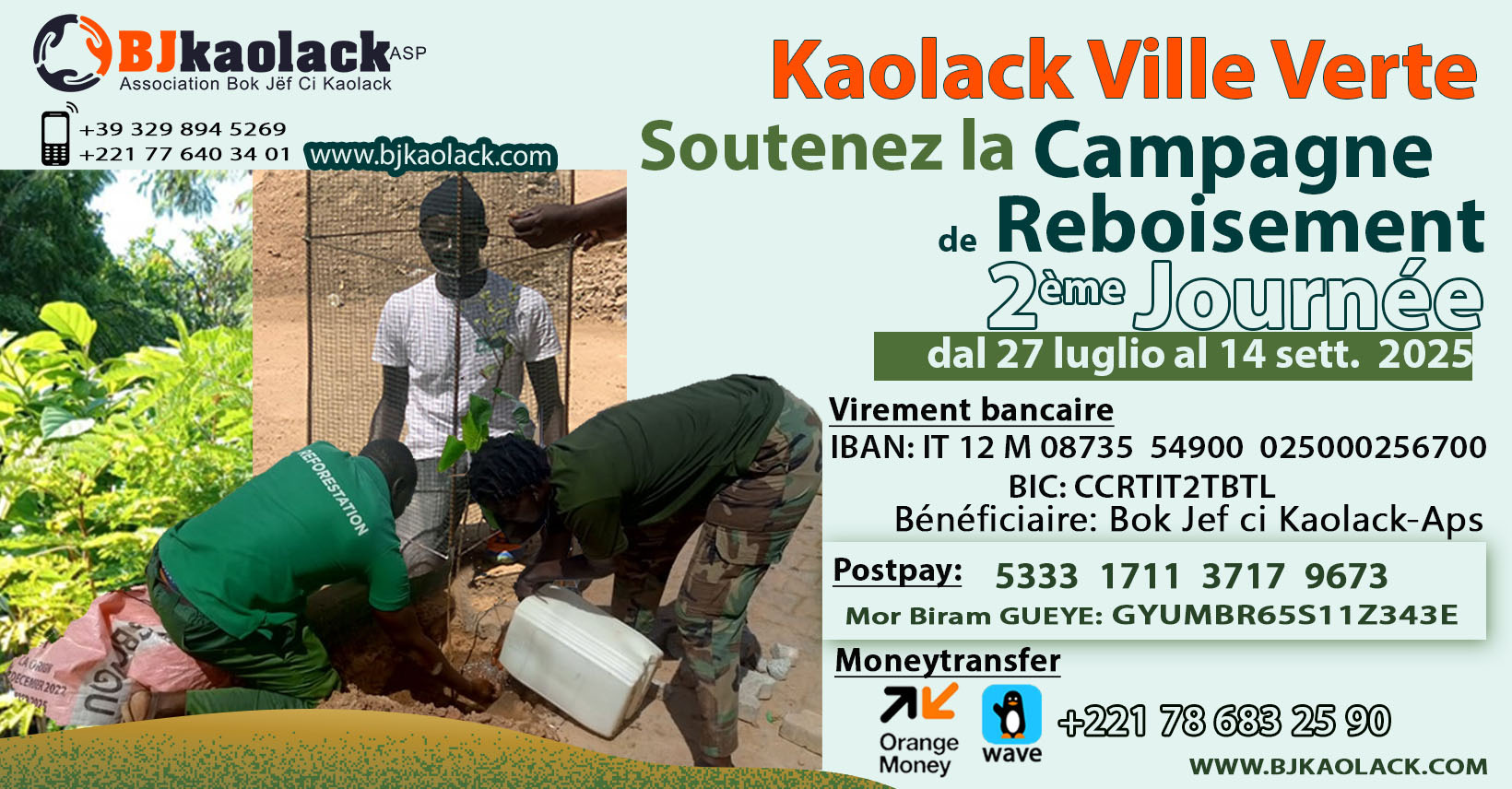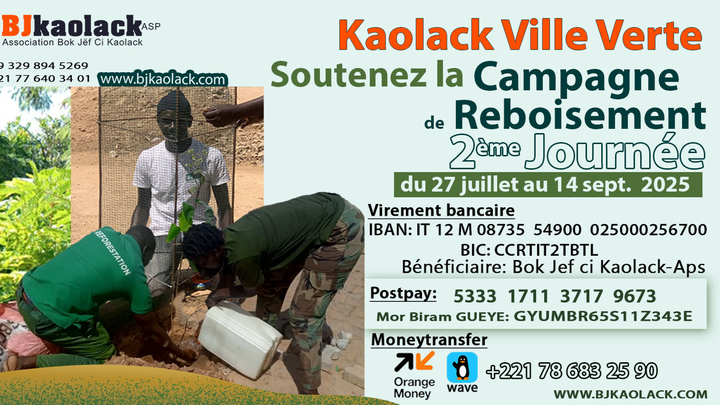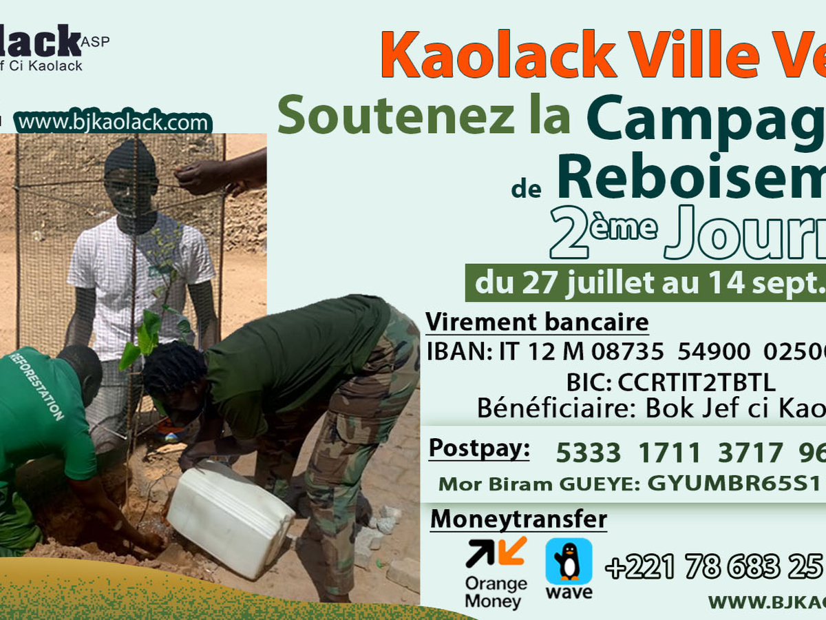 Face au défi climatique, à la nécessité de stratégies et mesures d’adaptation et d’atténuation, un ambitieux projet de reboisement dénommé «Kaolack ville verte» est initié par l'Association Bok Jef Ci Kaolack -Aps basée en Italie, en collaboration avec les associations de quartier de Kaolack, le service des "Eaux et Forets" et autres.