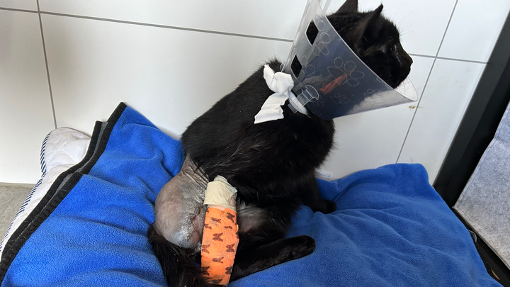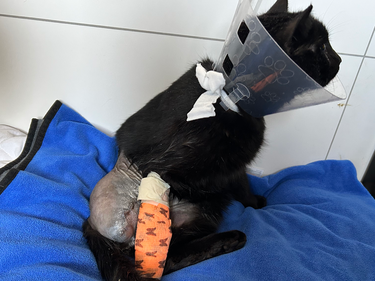 In Panik fuhren wir zum Tierarzt, wo wir die verheerende Nachricht erhielten: Rabe hat einen fünffachen Bruch des Oberschenkels. Heute musste ihm leider das Hinterbein amputiert werden. Doch das ist erst der Anfang – die medizinischen Kosten werden sich weiter anhäufen, da er zusätzliche Kontrollen benötigt und mit Schmerzmitteln sowie Antibiotika behandelt werden muss.