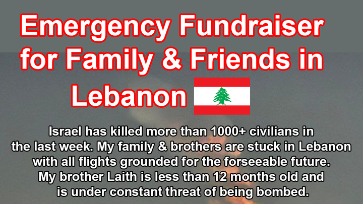 Over the last week, Israel has bombed many locations accross Lebanon without discrimination towards civillians and civil infrastructure. Today (September 28th, 2024) bombs struck less than 3 minutes away from my sister's family residence. The growing possibility of my sister's husband Ousama and his family being bombed by Israel is looming larger and larger over our heads.