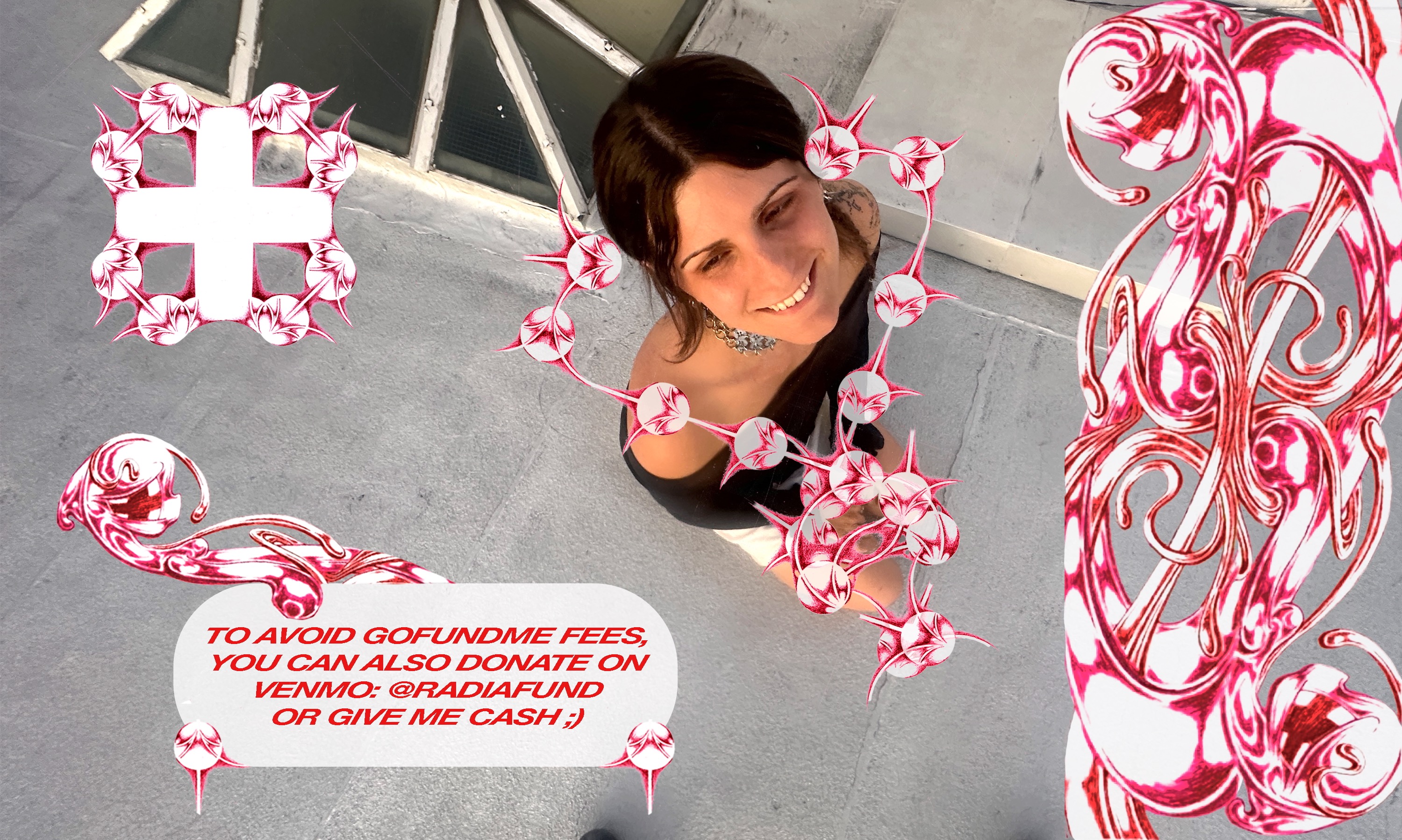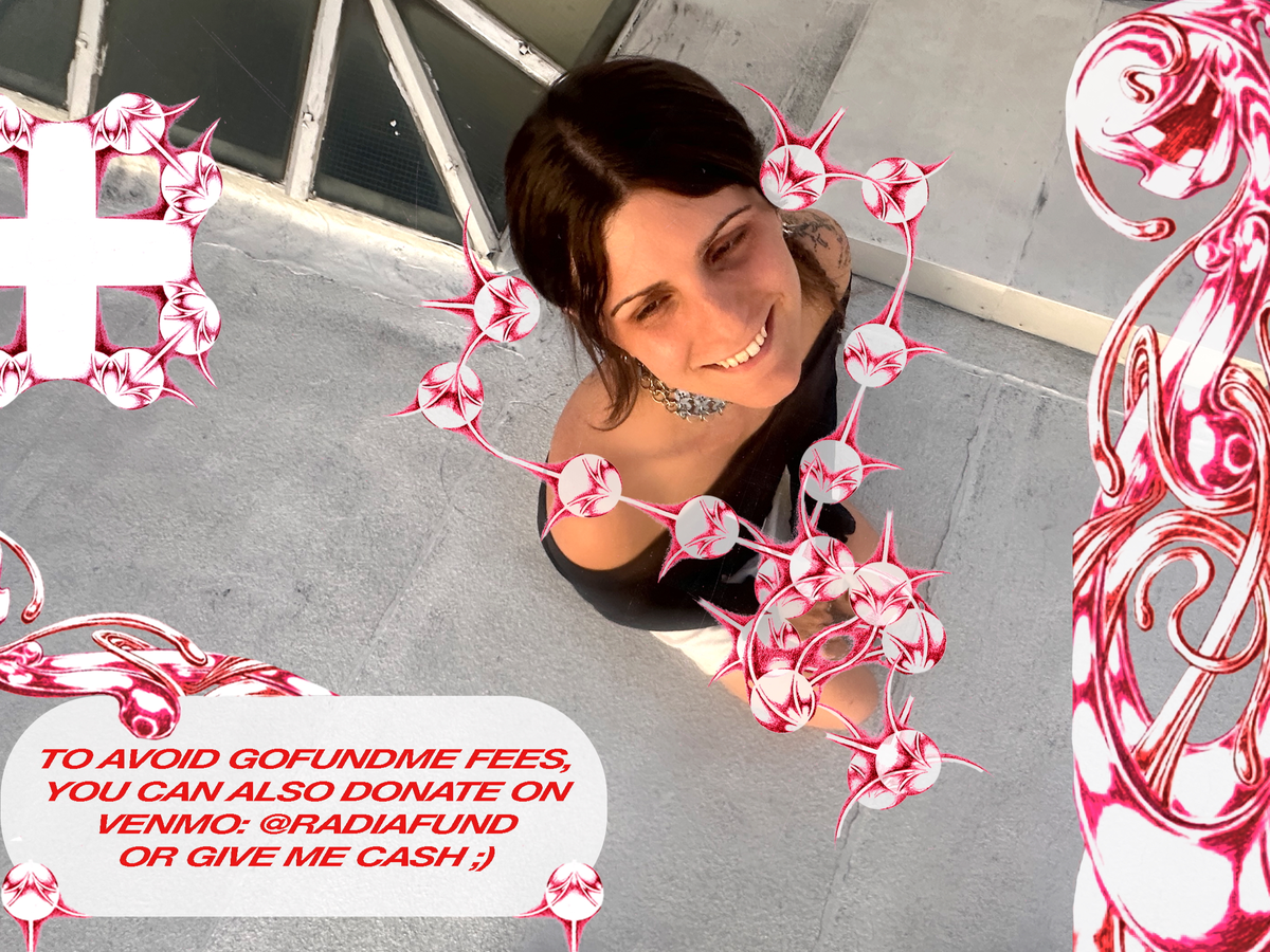 Hello, my name is Radia, and you may have known me by other names in the past. Over the past few years I’ve been an artist, tattooer, welder, and community arts organizer in New York City. I am also a trans woman, and I am starting this fundraiser to ask my community to help me actualize the surgery I’ve worked towards the past six years.