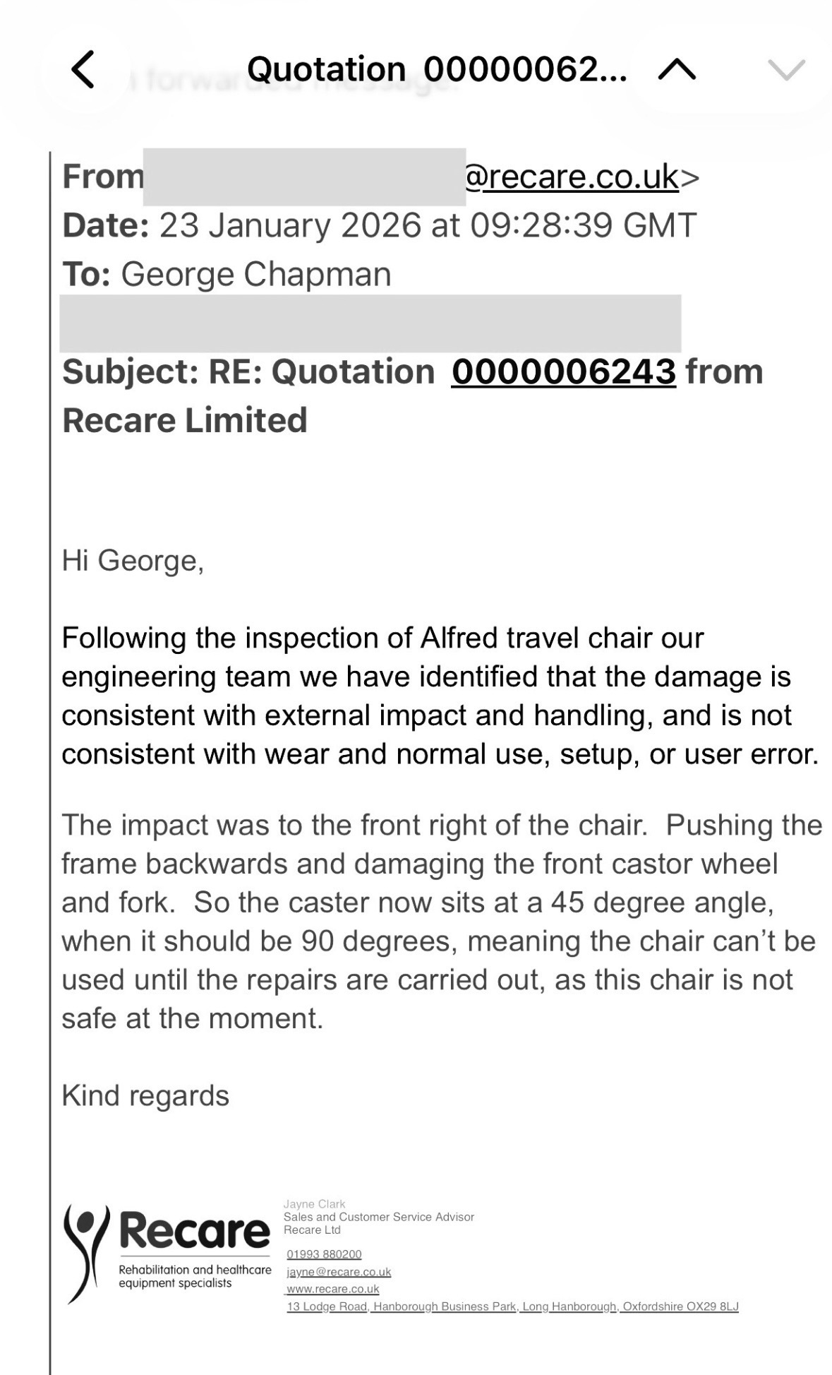 The chair was brand new before our trip to Toronto, funded by Jaguar Land Rover. It has recently been assessed by the manufacturer and is deemed unsafe for use due to impact damage!! This, like all disability equipment costs a mini fortune!