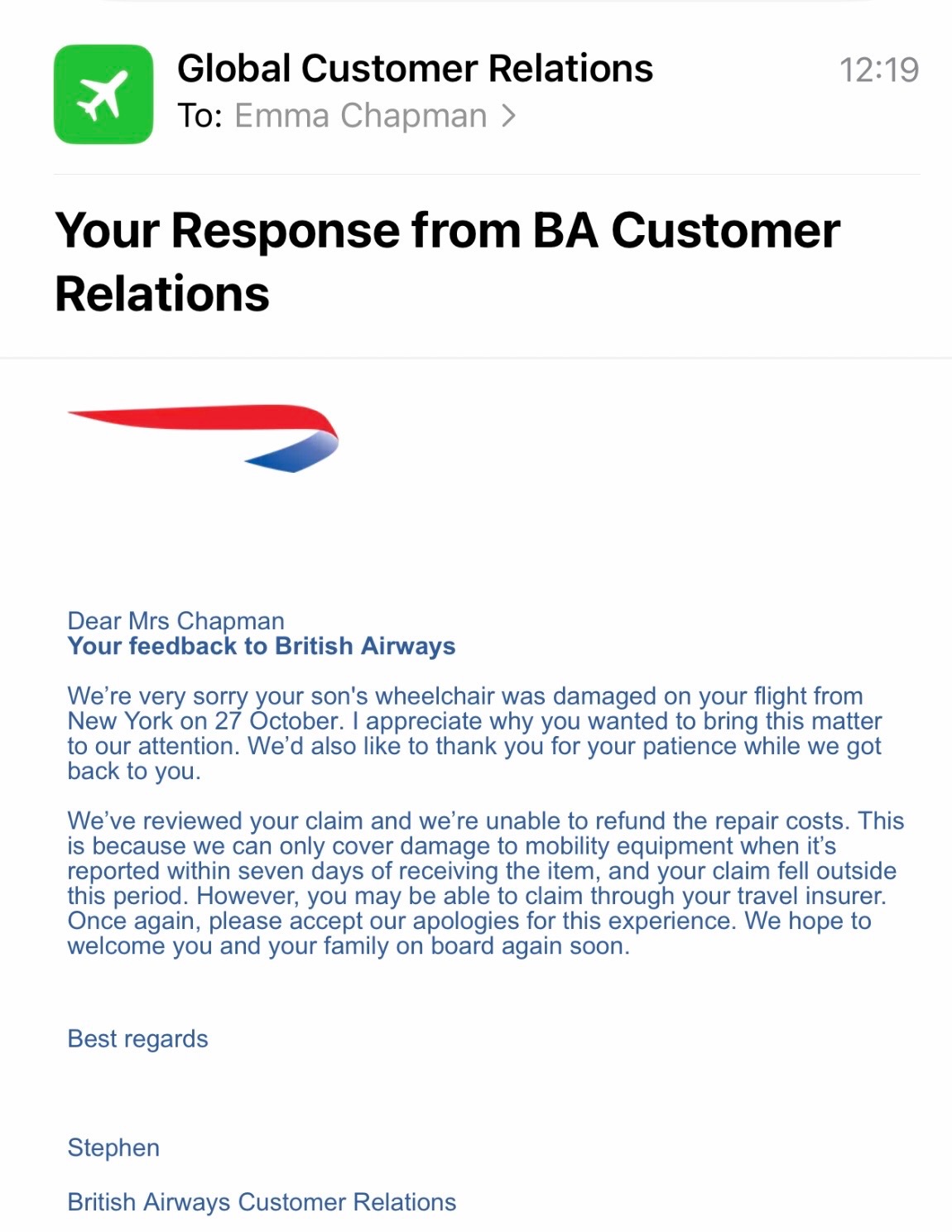 I have attached the emails from the wheelchair company and the airline involved.