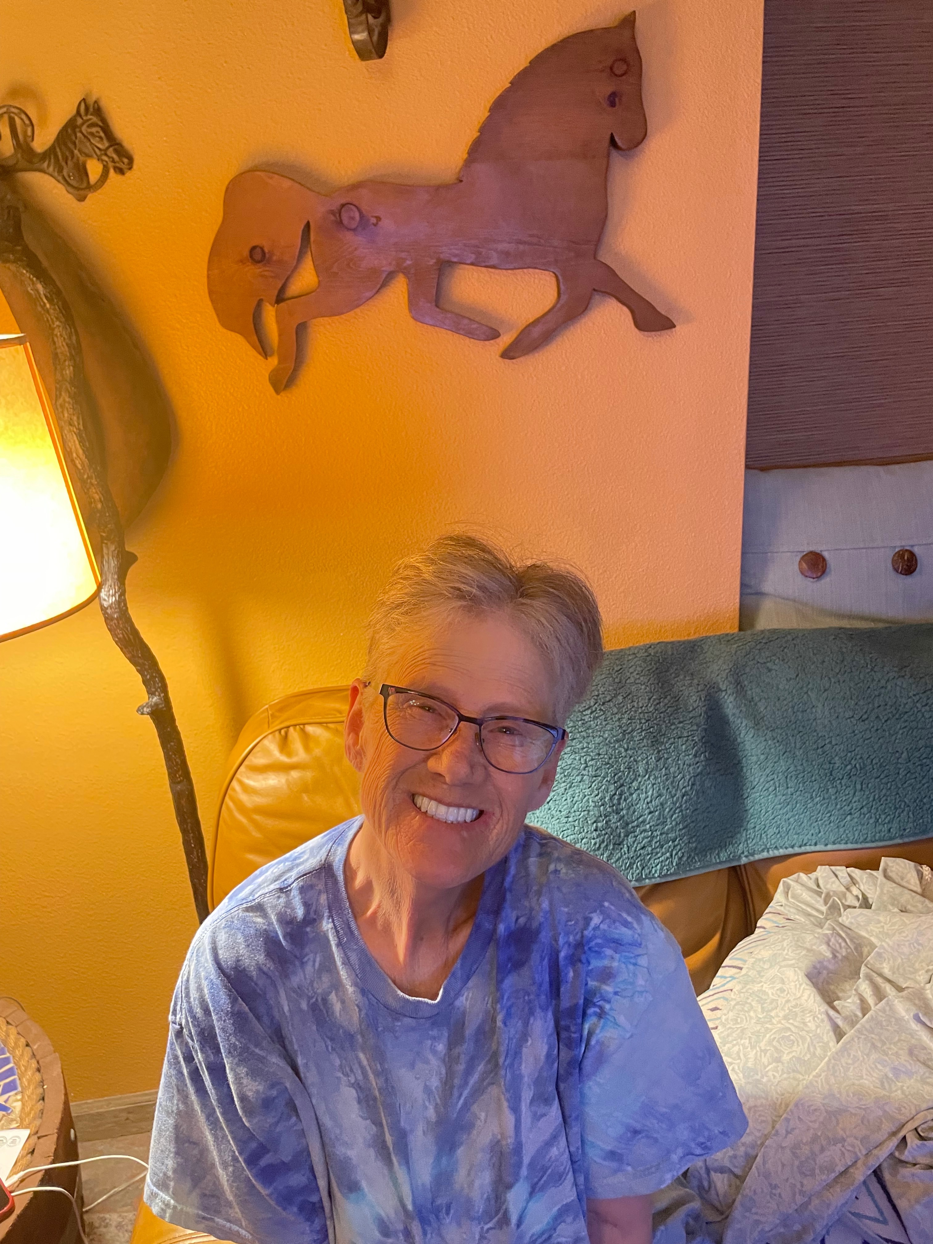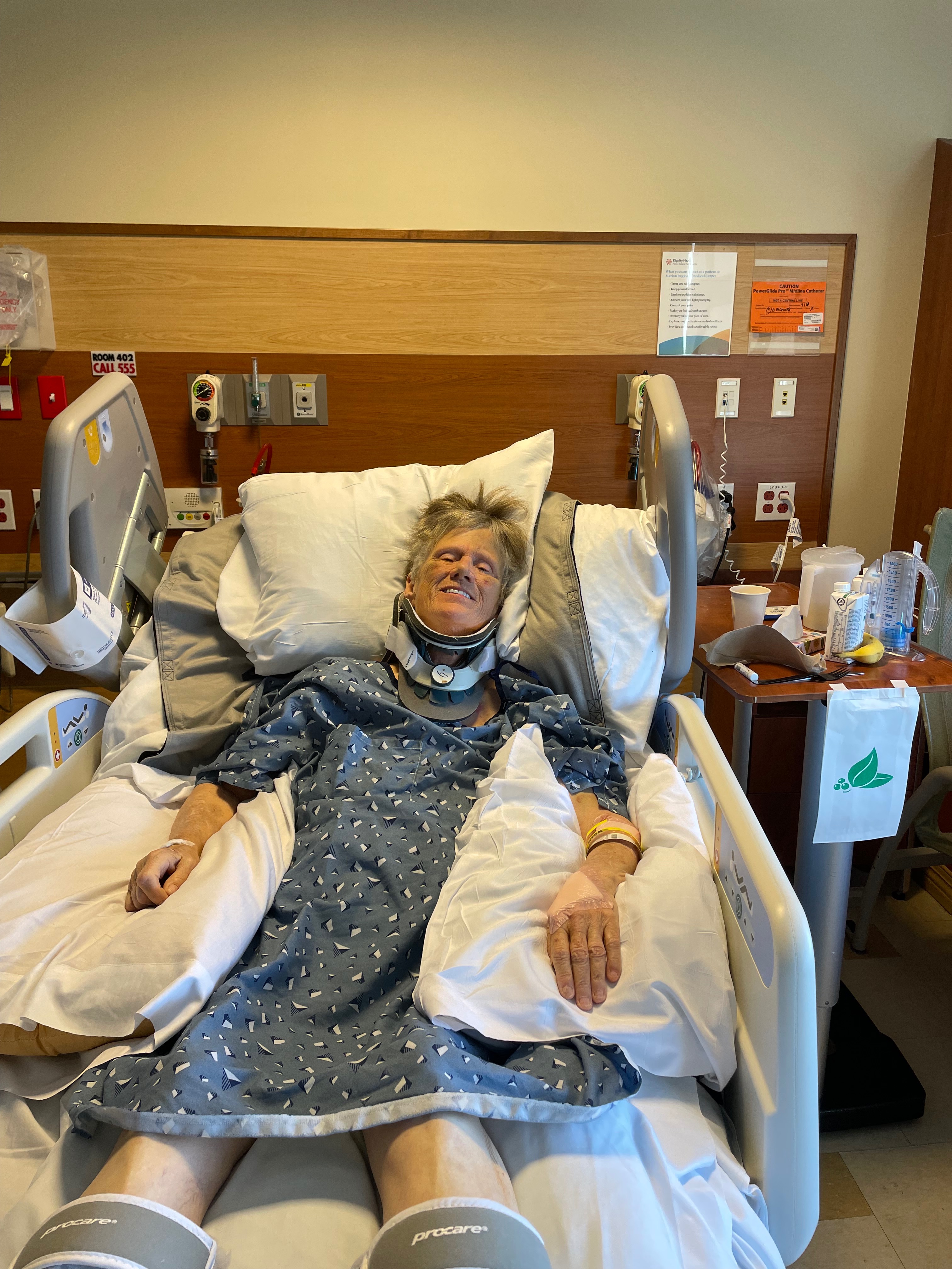 Recently, she had a terrible and debilitating experience. She fell down a flight of stairs in our home and fractured her c-spine in five or six places, doing damage to her spinal cord. She spent 2 1/2 weeks at Marian Medical Center for medical treatment, after which she was transported to Santa Clara Valley Medical Center in San Jose, CA, where she is receiving intense therapy for her c-spine injuries. Presently, she has no use of her arms and legs. The costs of her care when she returns will be expensive.