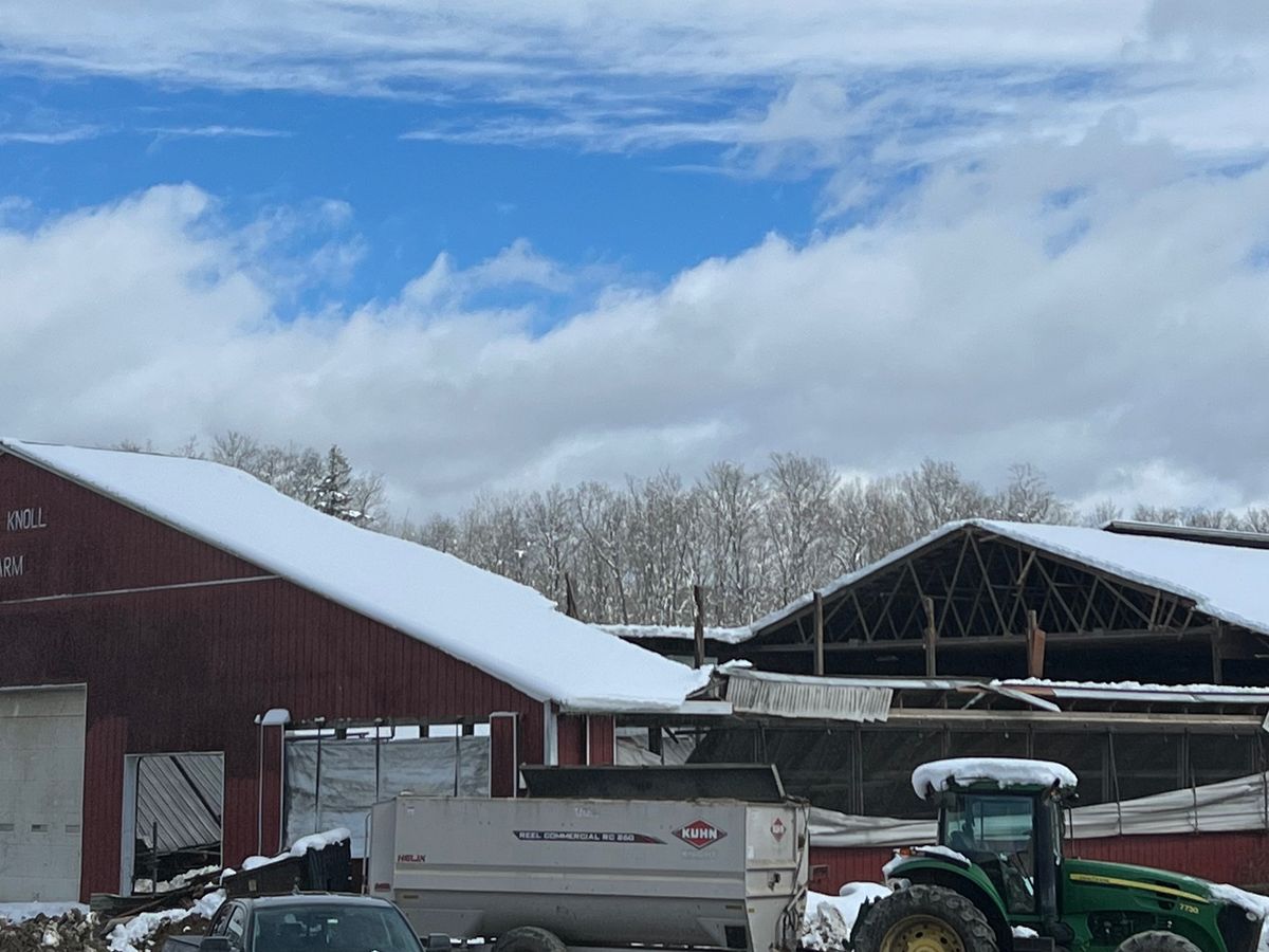 My name is Rene Boardman and I am trying to raise money to help our dear family friend and fellow dairy farmer, David Jacquier of Elm Knoll Farm. During the recent snowstorm, David’s heifer barn at Elm Knoll suffered a roof collapse. Thankfully no people were injured, but unfortunately he did lose 3 cows. Today was spent helping him clear debris with friends, family, and fellow farmers so we could get the remaining cattle to safety in another barn.