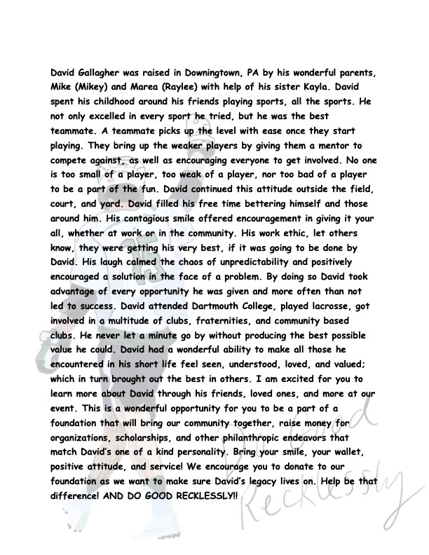 The DG Do Good Foundation was founded in 2022, in memory of David Gallagher. Dave served as a role model to all around him; he was a kind, compassionate, and hardworking individual who was invariably optimistic and always had a smile on his face.