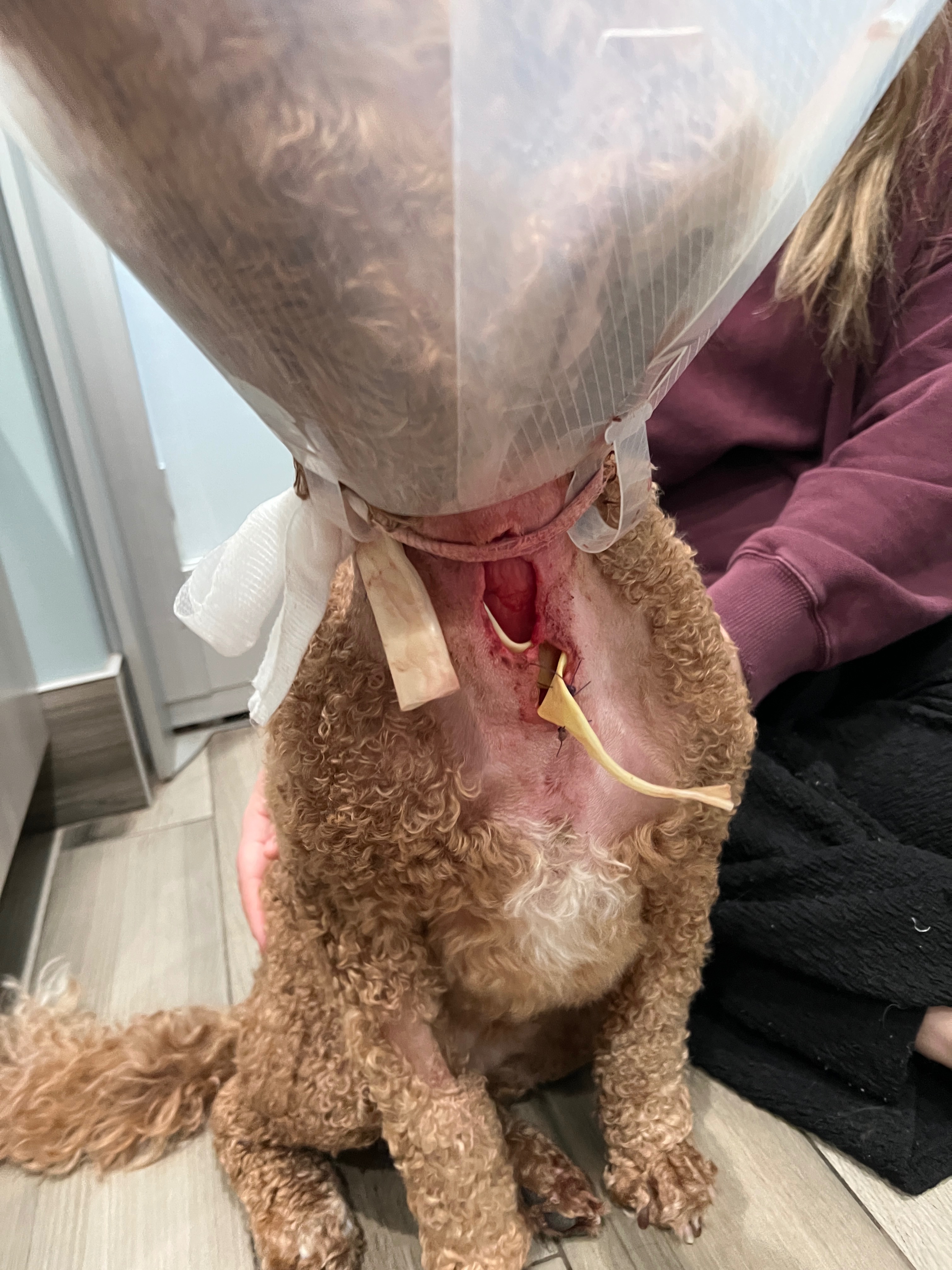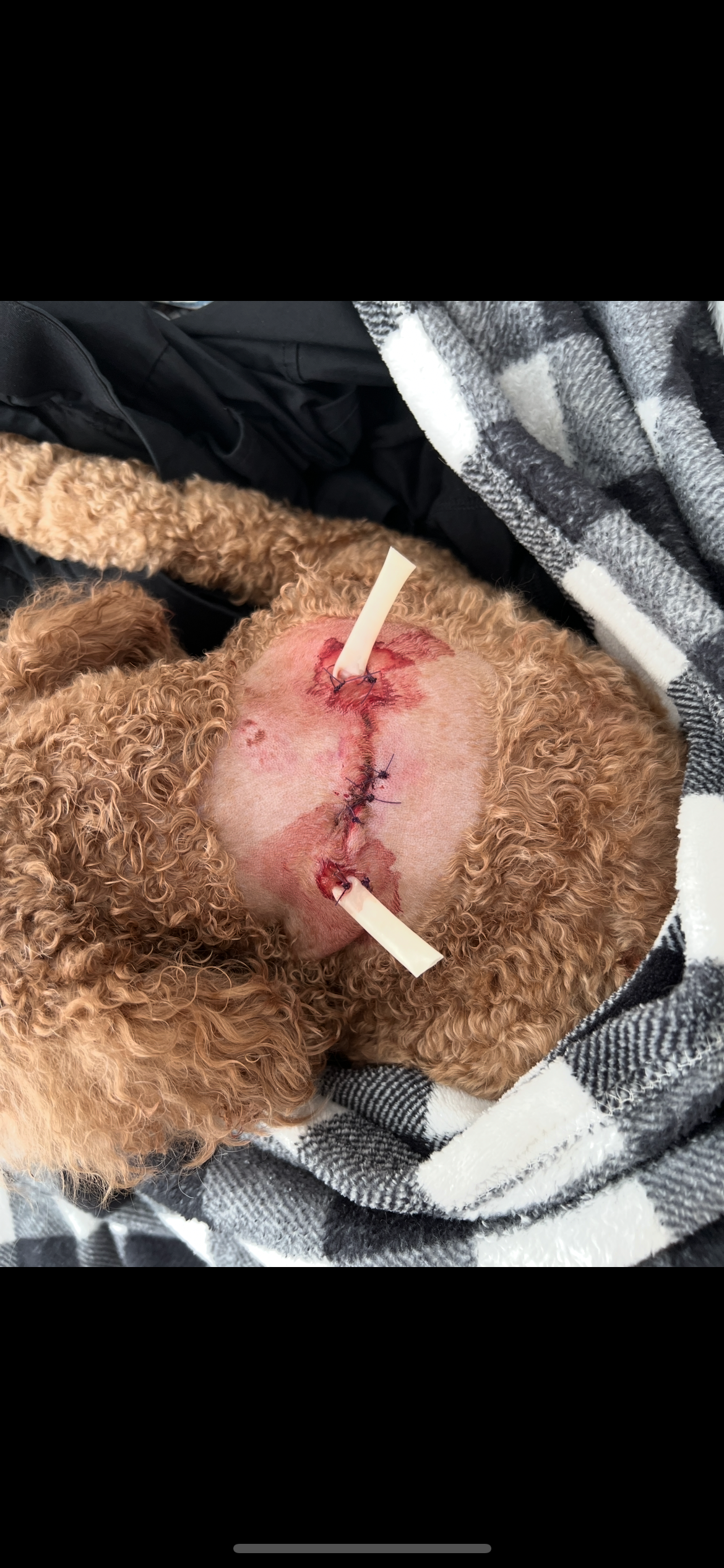 Winnie is now all stitched up and still has one drain tube in her neck. She is on mild sedation, but healing and happy to be back home with her much loved paw-rents.