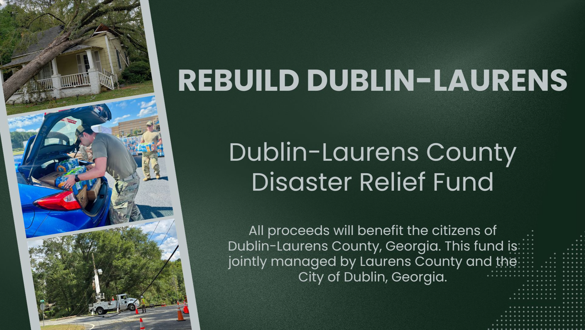 The Dublin-Laurens County Disaster Relief Fund has been established to provide immediate and long-term support to those affected by this disaster. Managed jointly by Laurens County and the City of Dublin, every dollar raised will go directly to the families in our community who need it most.
