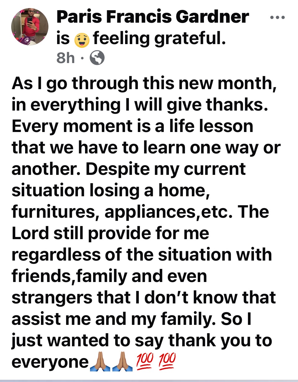 We're setting up this GoFundMe to help the Gardner family get back on their feet. No donation is too small—every dollar brings hope and relief. If you’re unable to contribute financially, sharing this post would mean the world. To know Paris is to love Paris. He makes a positive impact on everyone he meets. Let’s help him in his time of need.