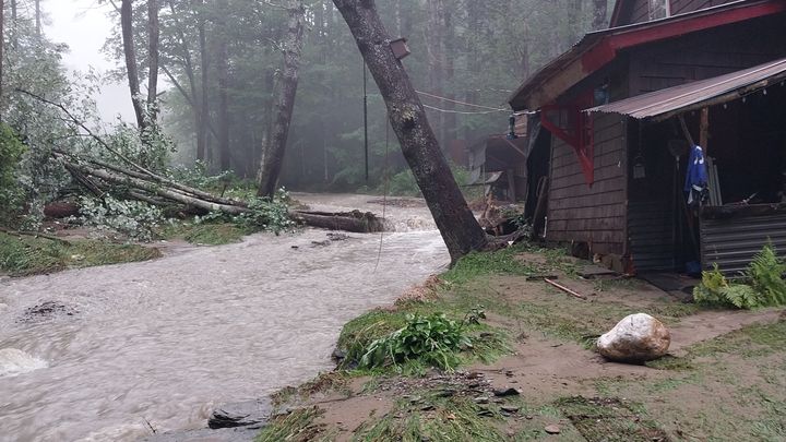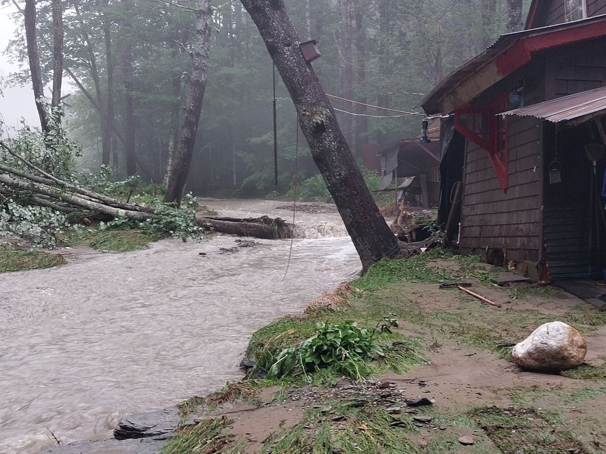 The brook that runs 8 feet behind our house completely surrounded the house for several hours. At its largest, it was 150 wide, raging like nothing we've ever seen. We had water ¼ of the way up our first-story windows and the interior of our home is inundated with water. We have several feet of quicksand-style mud covering our entire property. If it weren't for a very large pine tree holding the ground together with its roots, our bathroom (which does not have a foundation) would have been torn off the house in the rapids. We had whole trees, couches, propane tanks, and BBQ grills floating by our bedroom window as water lapped waist-high up our home. We have had no power for two days, and our water intake spring line was torn off the house. We have still yet to find the other end and reconnect it.
