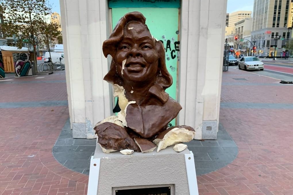 The sculpture of Breonna Taylor installed at Latham Square in Downtown Oakland two weeks ago has been vandalized and smashed.