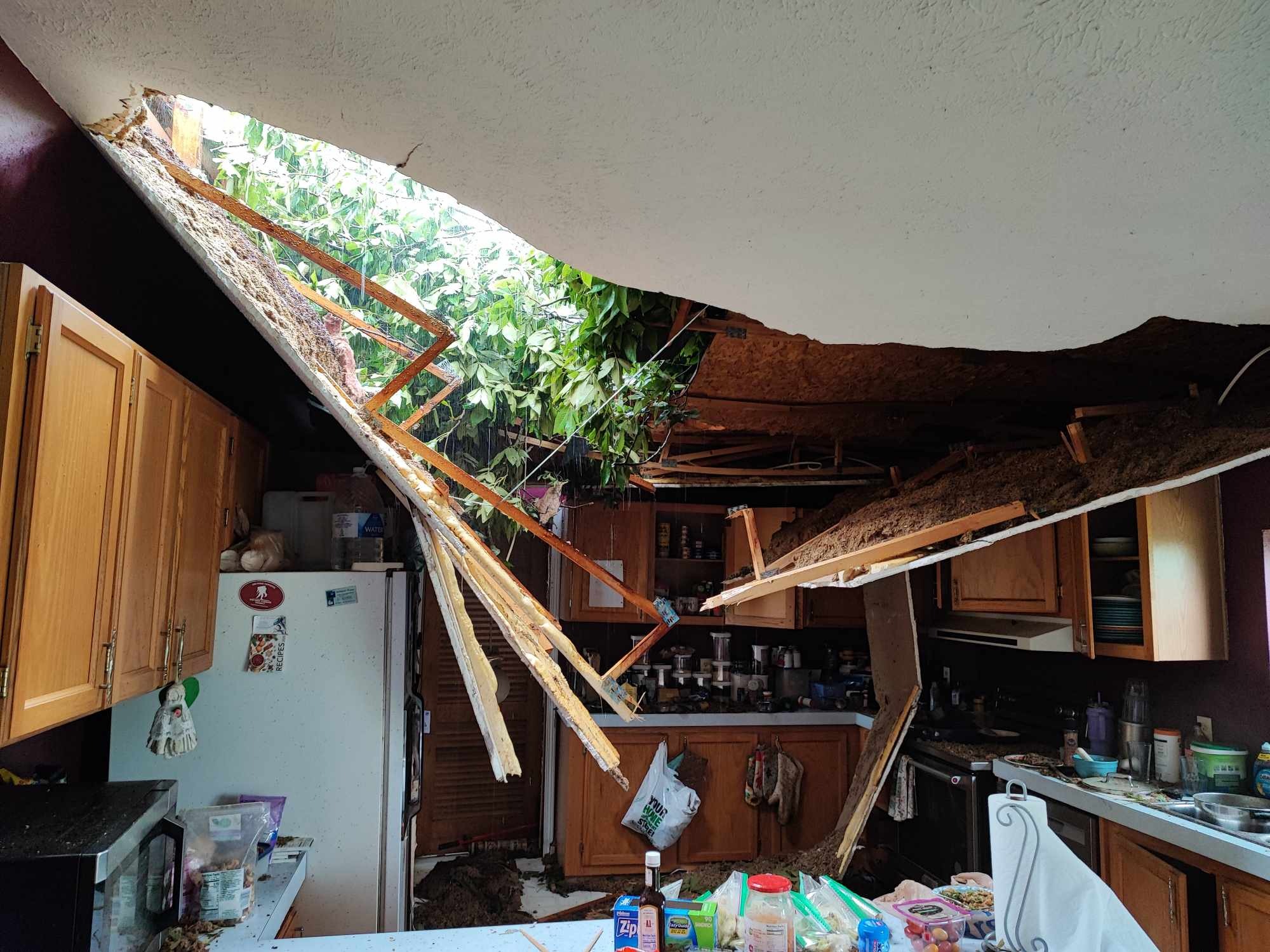 After the tornado passed, we assessed the damage and prioritized getting my mom to safety. Our home was severely damaged, with broken windows, glass and leaves scattered everywhere, and two trees lodged in our kitchen and laundry room. Outside, the destruction was total – our front porch was gone, trees were snapped like toothpicks, and our driveway was littered with debris and big trees.