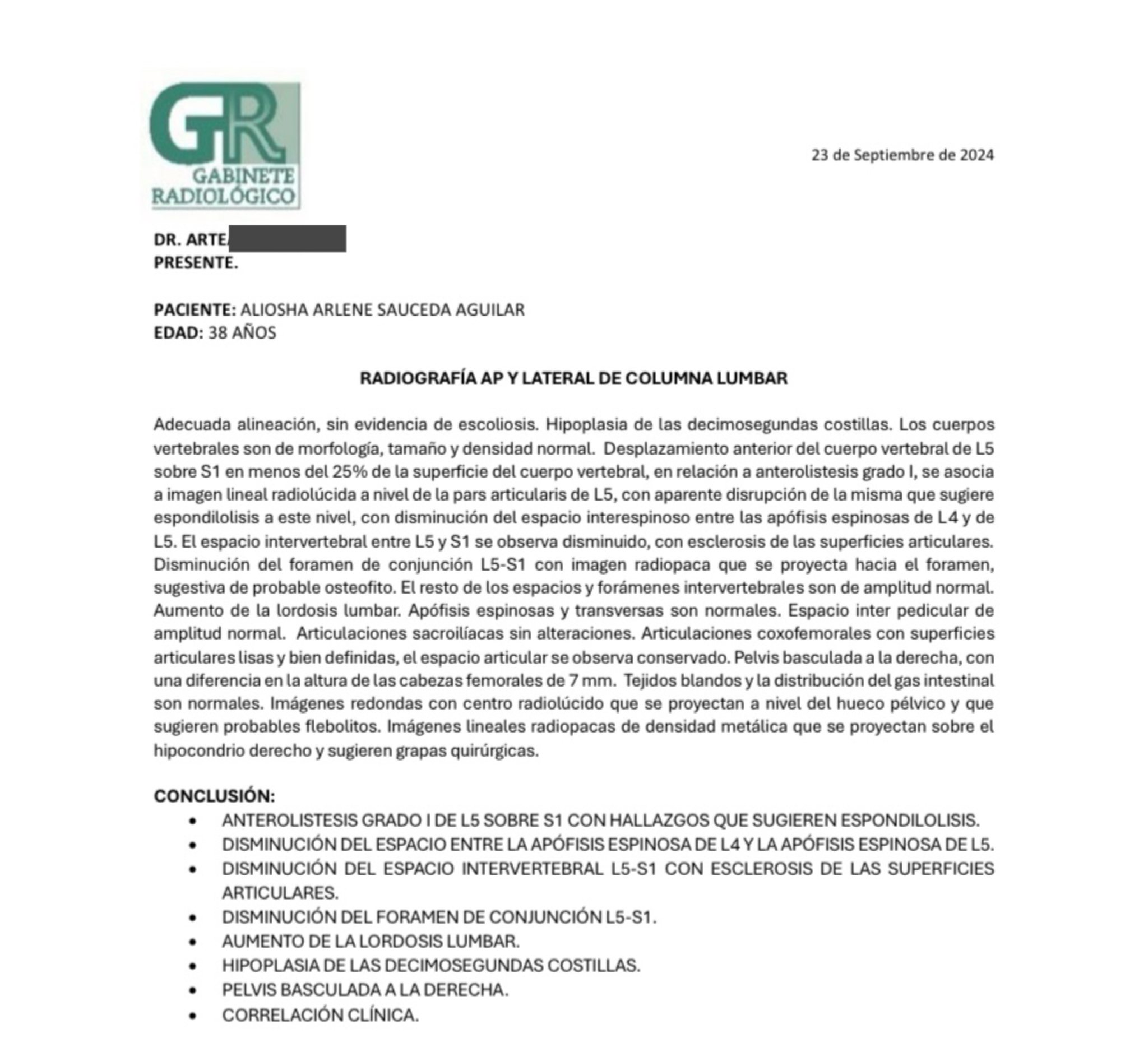 Fui diagnosticada con Espondilolistesis L5 S1 Grado 2, una fractura en una vértebra que provocó el desplazamiento hacia adelante de mi columna, además de una hernia y la pérdida de un disco intervertebral.