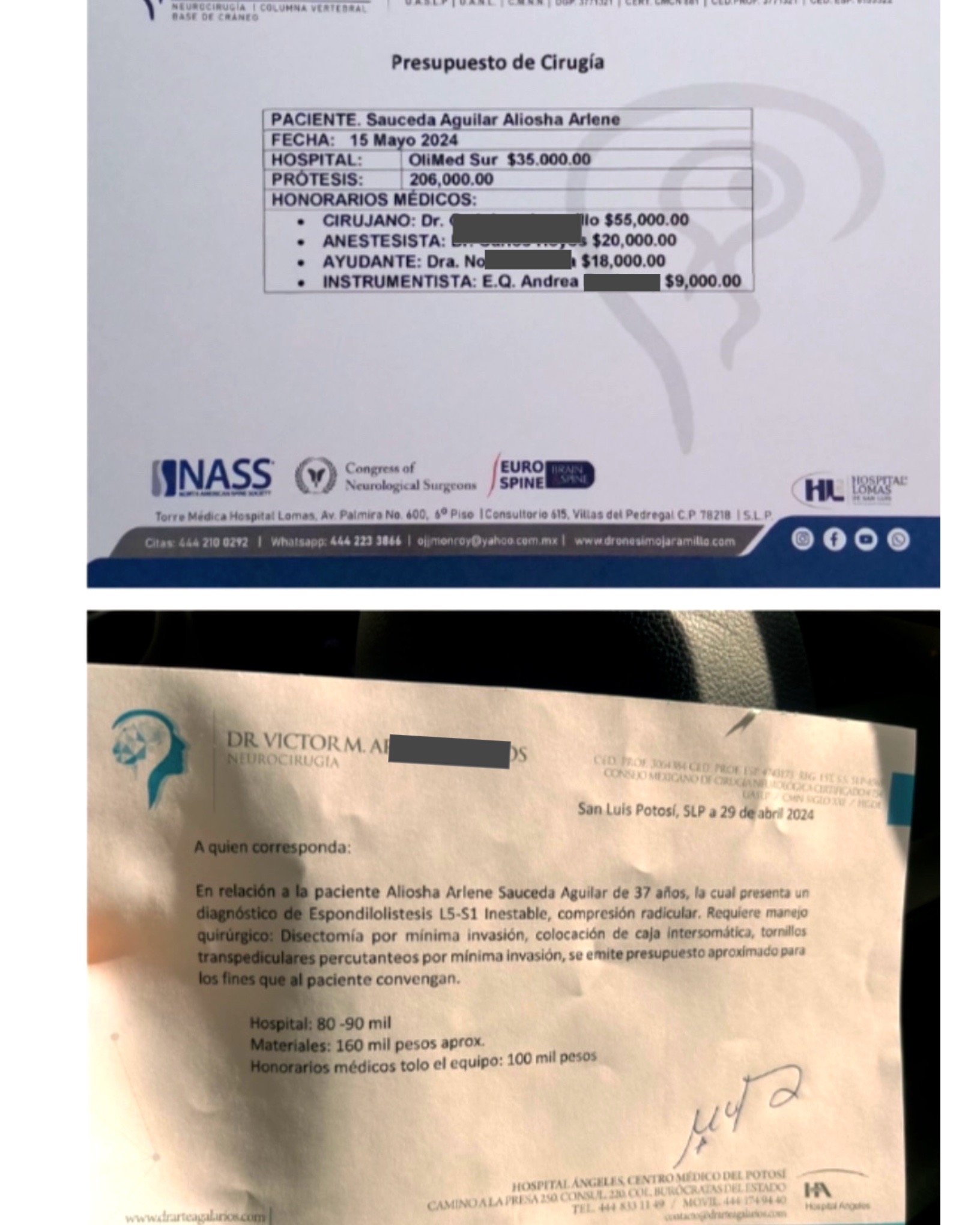 La cirugía consiste en la colocación de cuatro clavos de titanio y una caja intersomática para estabilizar mi columna y mejorar mi condición. El costo total de la cirugía es de $360,000.00 MXN, más los estudios preoperatorios necesarios.