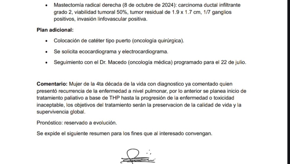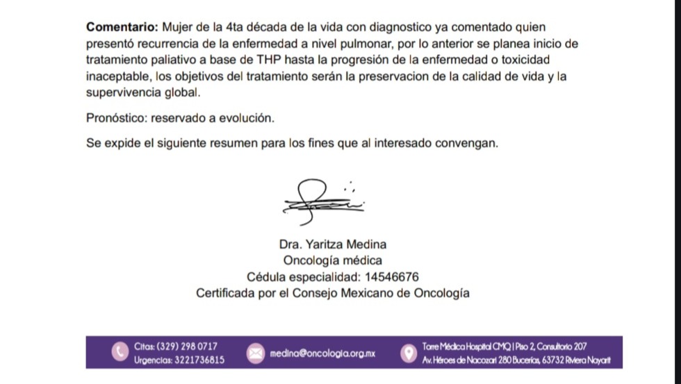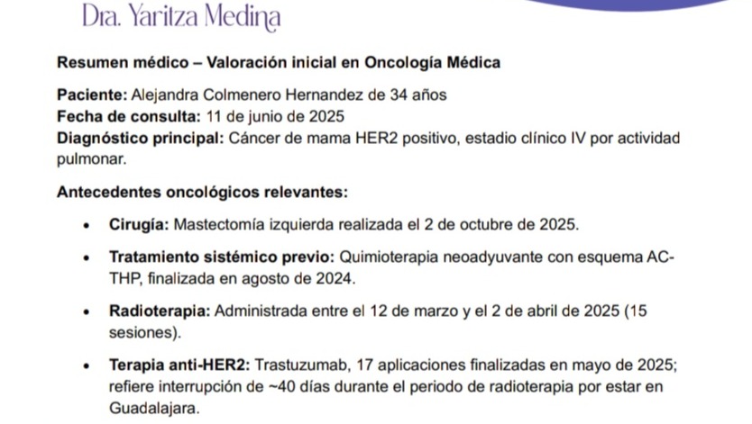 https://pacs.evacenter.com/v2/mobile_viewer/?studyId=30955174-dd78-498f-a72d-543774ca39ee&tab=report&ac=dXNlcj1ob3NwaXRhbC12YWxsYXJ0YS1tZWRpY2FsLWNlbnRlckB2aXNpdGFudC5jb20mcGFzc3dvcmQ9YmZkODMxZDktNDA5ZS00NzI4LTgzMTUtOTcwYmFlYzUxMjA0JmV4dHJhX3ZhbGlkYXRpb249MGZmYzcyZmUtNDIxMi00N2IxLWI1NWYtMzM0Y2Q0ODRiMmFh%3D%3D&md=1Hola mi nombre es angel de leon estoy solicitando apoyo para mi esposa alejandra colmenero el cual sera para poder costear el medicamento pertuzumab es para poder a completar las quimioterapias ya que el imss no cuenta con el medicamento y a estado recibiendo el tratamiento incompleto el diagnóstico de ella es cáncer de mamá her2 positivo en etapa 4 mismo que a creado metástasis en los pulmones. Si se ponen a investigar se que el diagnóstico es muy complicado pero las ganas de seguir adelante y agotar todas las posibilidades por muy mínimas que sean es muy grande... el pertuzumab es el medicamento capas de atacar este tipo de diagnóstico sin embargo es muy caro y el imss tiene desabasto de este medicamento..los fondos recaudados serán para poder costear el tratamiento mismo que consiste en 6 siclos el primero debe ser de 800 ml y los otros 5 de 400 ml cada 1...