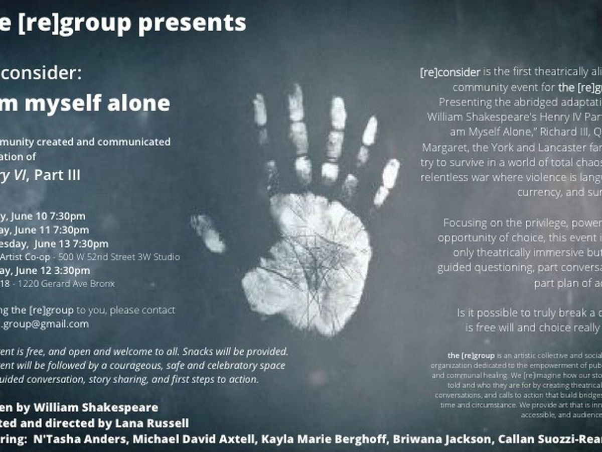 [re]consider is the first theatrically aligned community event for the [re]group. Presenting an abridged adaptation of William Shakespeare's Henry VI Part III, [re]consider focuses on the privilege, power, and opportunity of choice, making audiences complicit in the question: is free will really free? Driven by our mission, this event is and will always be free to the public. Following the performance, we will provide a guided conversation inspired by [re]consideration.