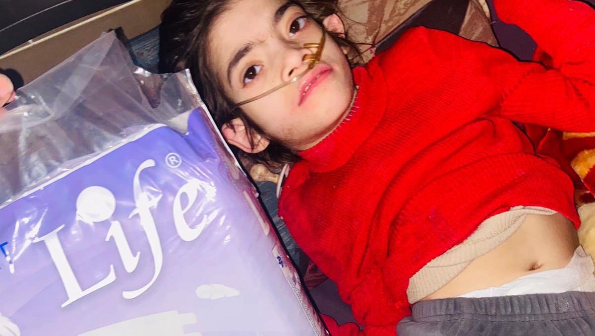 “She is Remas, a child with complete cerebral palsy. She needs Pampers, milk, and Cerlac. I cannot meet her needs. She lives in Palestine, Gaza, Deir al-Balah.”