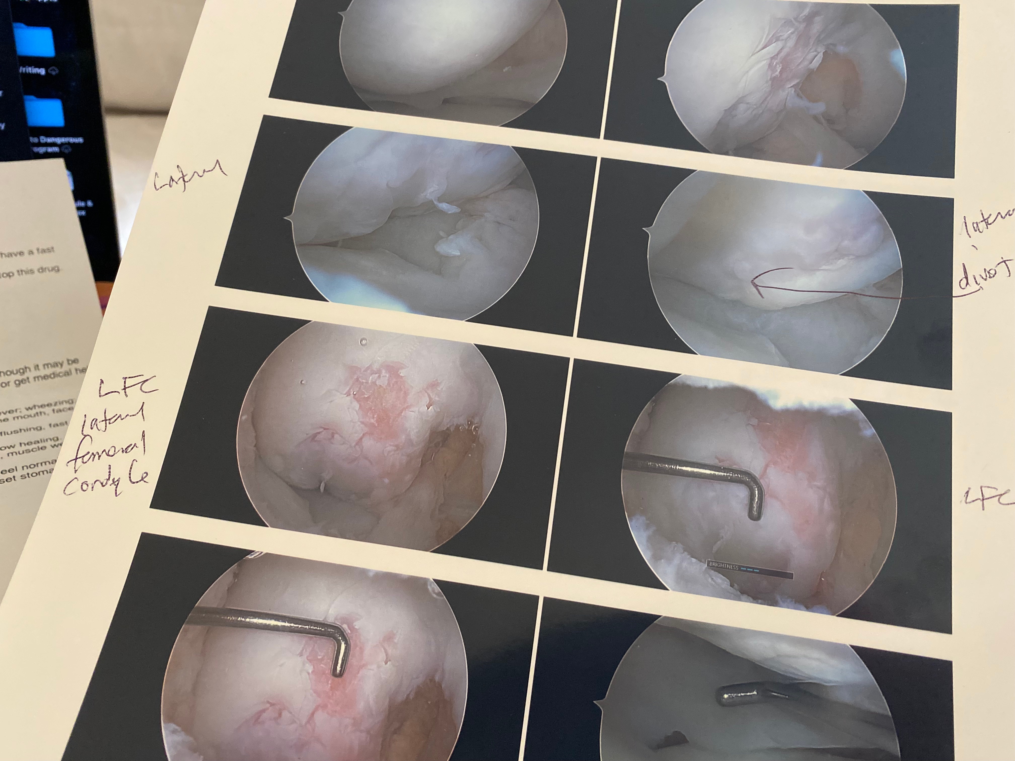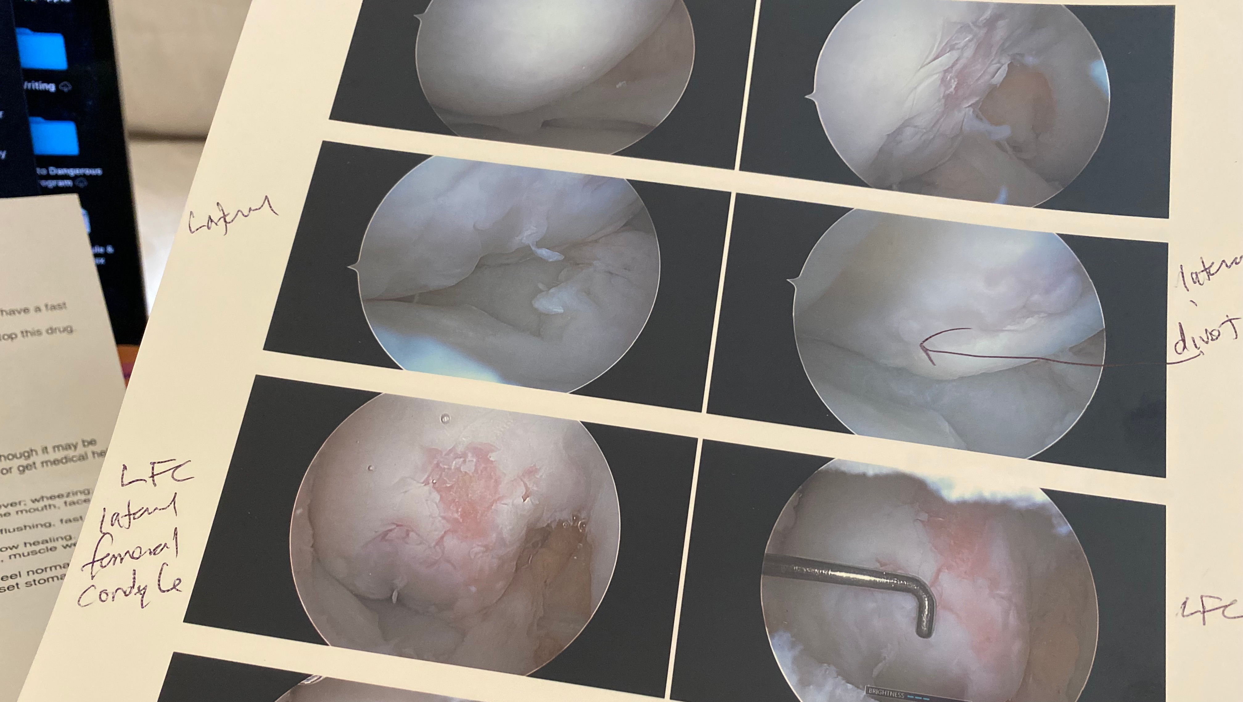 After suffering weeks of unexplained radiating pain, I sought the help of another surgeon, who discovered severe cartilage damage on the outside of my knee—a large grade 4 lesion with exposed bone. I was told the underlying bone had been fractured, resulting in permanent bone loss.