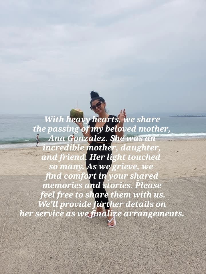 With heavy hearts, we share the passing of my beloved mother, Ana Gonzalez. She was a beautiful soul, a free spirit, and the strongest woman we knew. After a courageous nine-year battle with cancer, she left this world surrounded by love, grace, and the legacy of a life well lived.