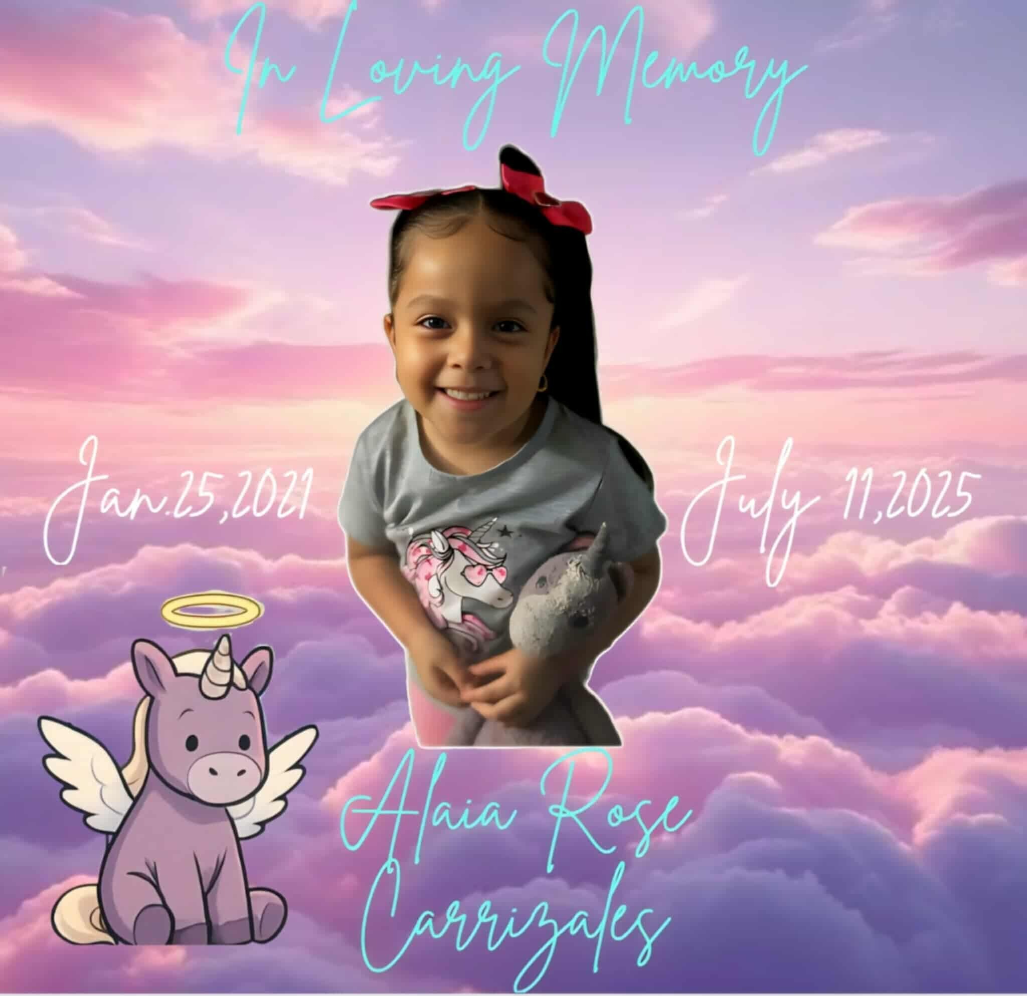 Alaia Rose Carrizales' life tragically ended in a car accident on July 11th, 2025. Alaia Rose was the bright light in our lives, and her absence has left our family shattered. She loved the world and everyone in it so much. She was surrounded by her aunts, uncles, grandparents and cousins daily which she loved because it meant she always had someone to be goofy with. Her contagious laugh and smile could brighten any room. Alaia loved to play dress up and always made sure to tell everyone around her that she was a princess. She loved to play outside, color and draw, and cover herself and any piece of furniture in her princess stickers. She had so much to give to all those around her. She enjoyed dancing with her unicorn plushy (which she named Baby). We came to believe that unicorn was her best friend, her guardian angel who lived every waking moment with her. She was full of love, joy, and happiness. She had so much life ahead of her that her departure leaves an immense void in all our hearts that will never be filled.