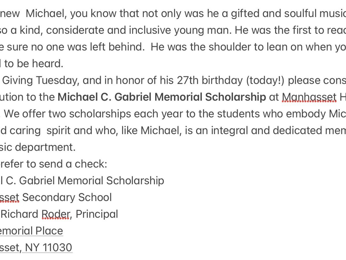 Scholarship at Manhasset High School. We offer two scholarships each year to those students who embody Michael’s gentle and caring spirit and who, like Michael, are an integral and dedicated member of the music department.