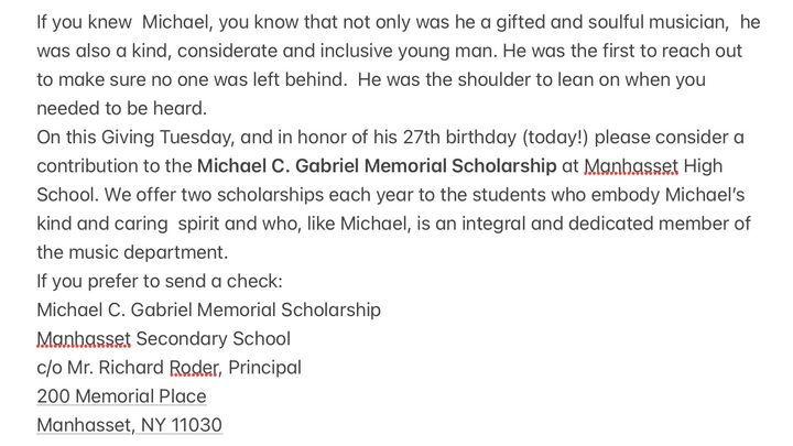 If you knew Michael, you know that not only was he a gifted and soulful musician, he was also a kind, considerate and inclusive young man. He was the first to reach out, and made sure no one was left behind. He was the shoulder to lean on and encouraged everyone to pursue their dreams. In honor of Michael’s 27th birthday…today! …please consider a contribution to The Michael C. Gabriel Memoral