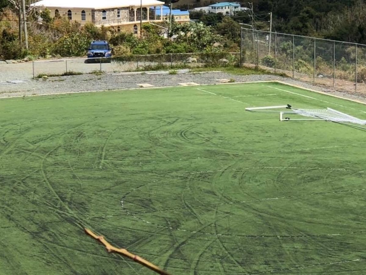 This happened last night! Someone smashed through one gate to the field, tried to drive out through the other one, smashed one of the soccer nets that we had just replaced post storm to pieces, and destroyed the surface by doing donuts!! This is the only field on St. John. It is used by the children of our island who are our students as well as students at JESS and Christian Academy, and open to anyone that wants to use it. On any given evening or weekend there are people playing soccer, ultimate frisbee or baseball. The complete lack of respect for everyone in the community who uses the space is heartbreaking! If anyone knows who did this, please go to the police! This is not who we are as a community!