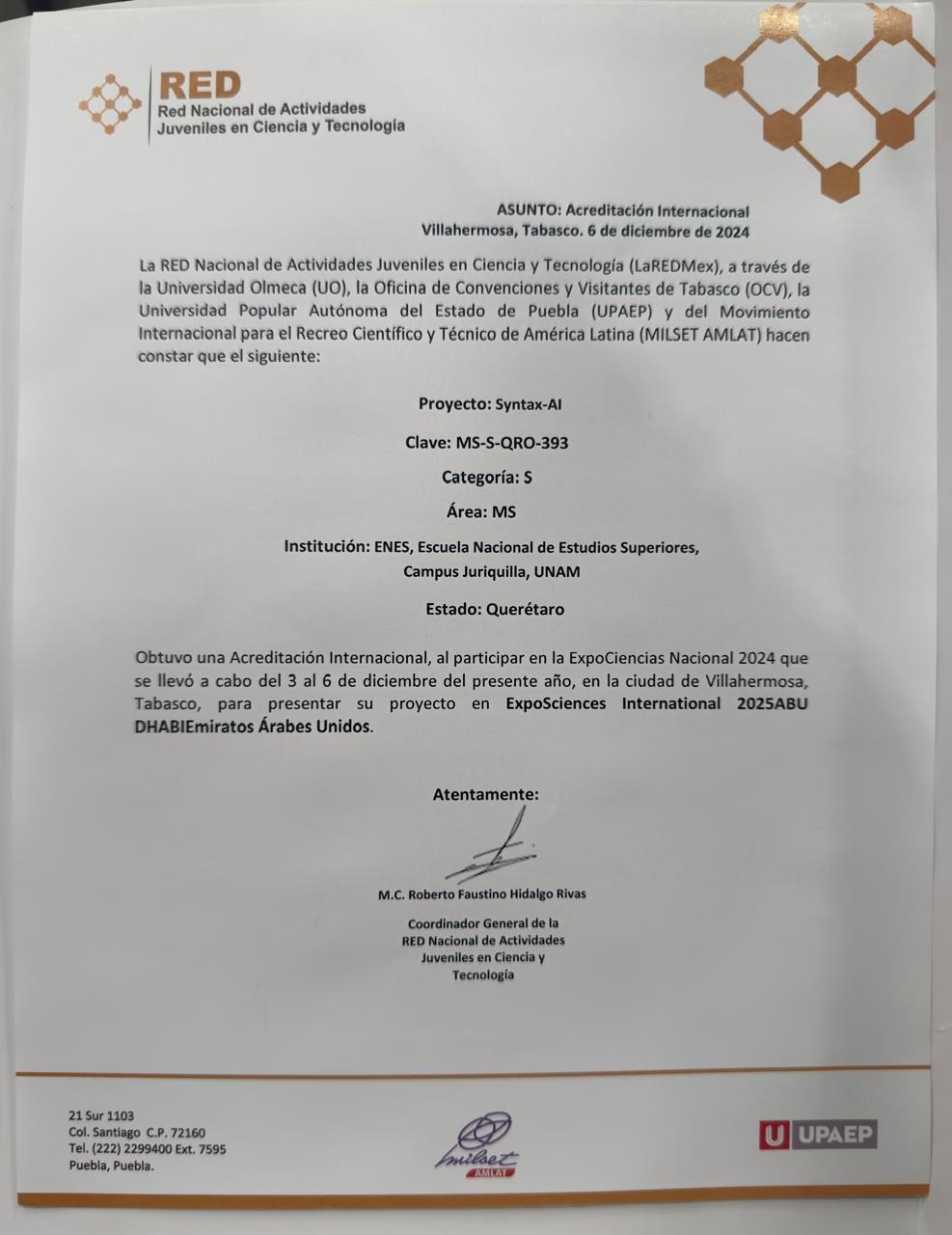 Tu apoyo no solo contribuye a mi desarrollo profesional, sino también pone en alto el nombre de México en un evento internacional de gran relevancia. Al regresar, compartiré los conocimientos adquiridos con la comunidad científica y profesional para seguir impulsando la innovación tecnológica en nuestro país.