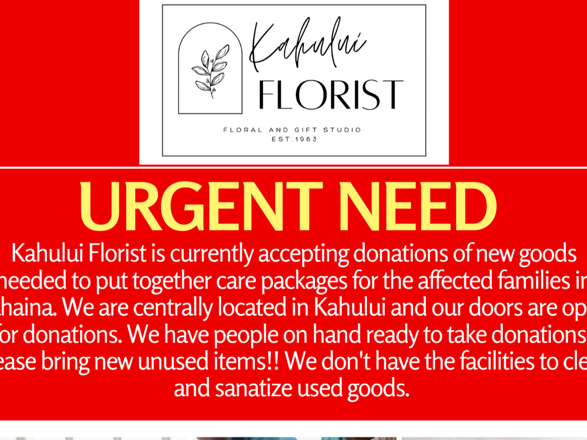 Kahului Florist has opened its doors to all donations to assist the families affected by the wildfires that have ravaged our tiny island home. While we know that some of you can’t be here to help, please consider donating anything you can spare.