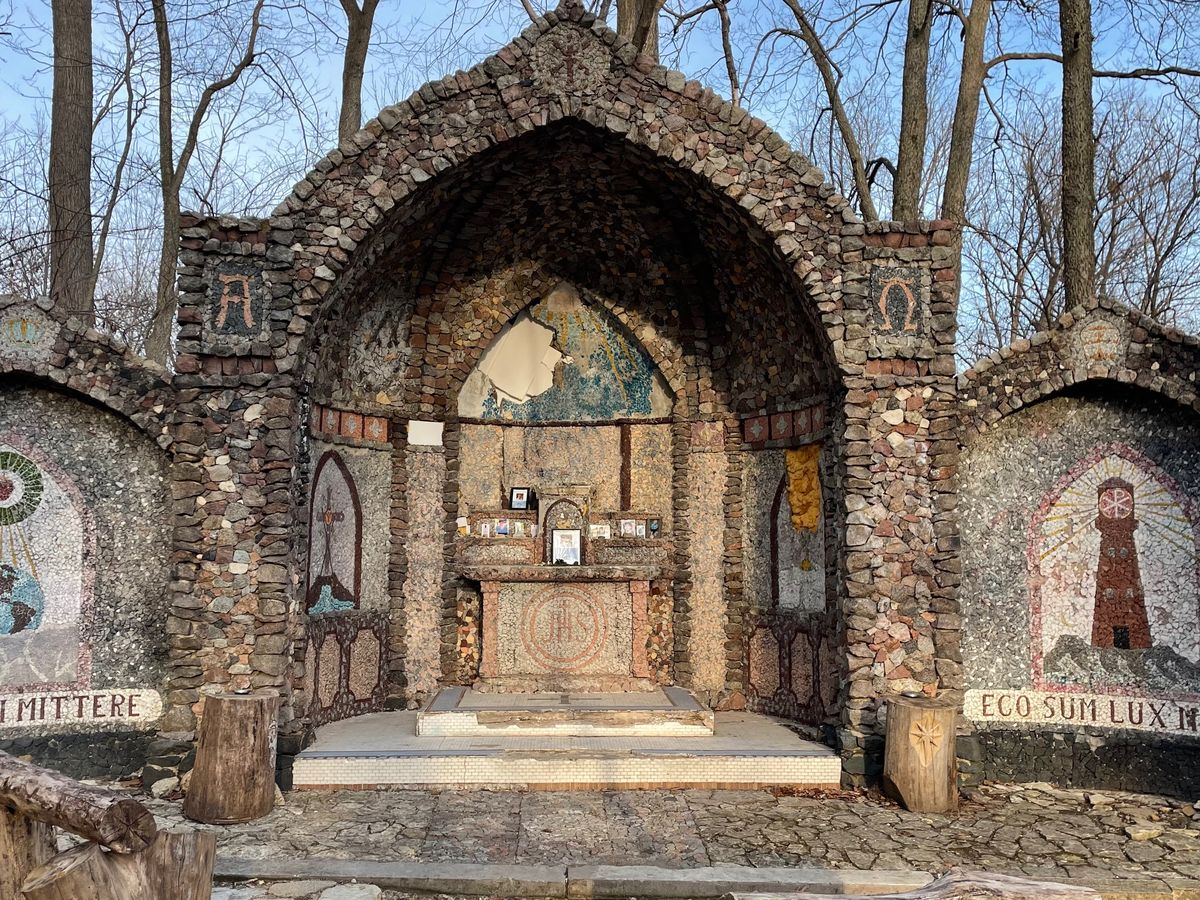 Perch atop a hill overlooking a stream, the grotto is a serene surprise for anyone who happens to come across it while wandering through the woods. It’s a quiet, peaceful spot. A nearby creek gurgles in the background, adding a soothing soundtrack.