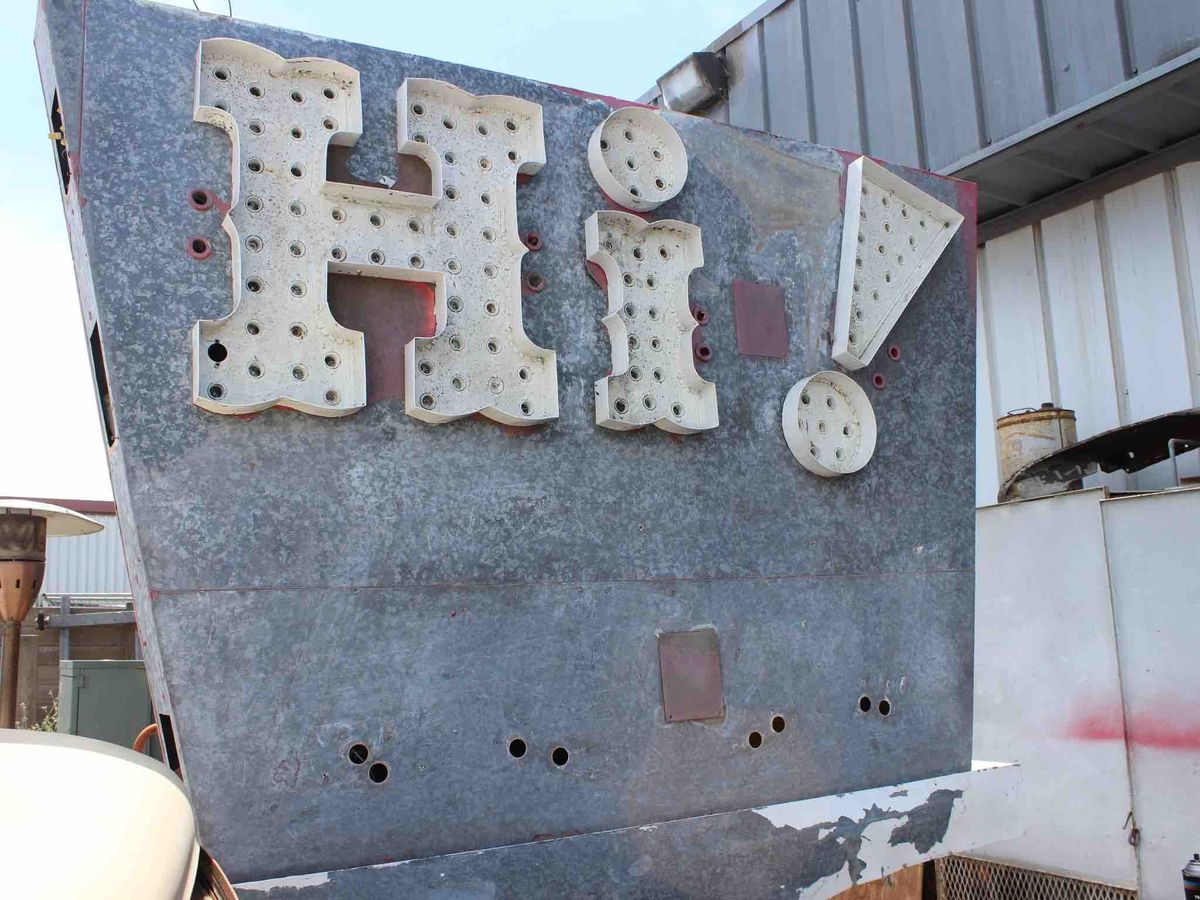 The Lompoc Valley Historical Society rescued the "Hi Let's Eat Sign" a few years ago. Today the sign restoration started at Hot Rod Alley to do the metal work and painting. All work, electrical and cement work will be done by local businesses. The finished sign will be put up at American Host restaurant.
