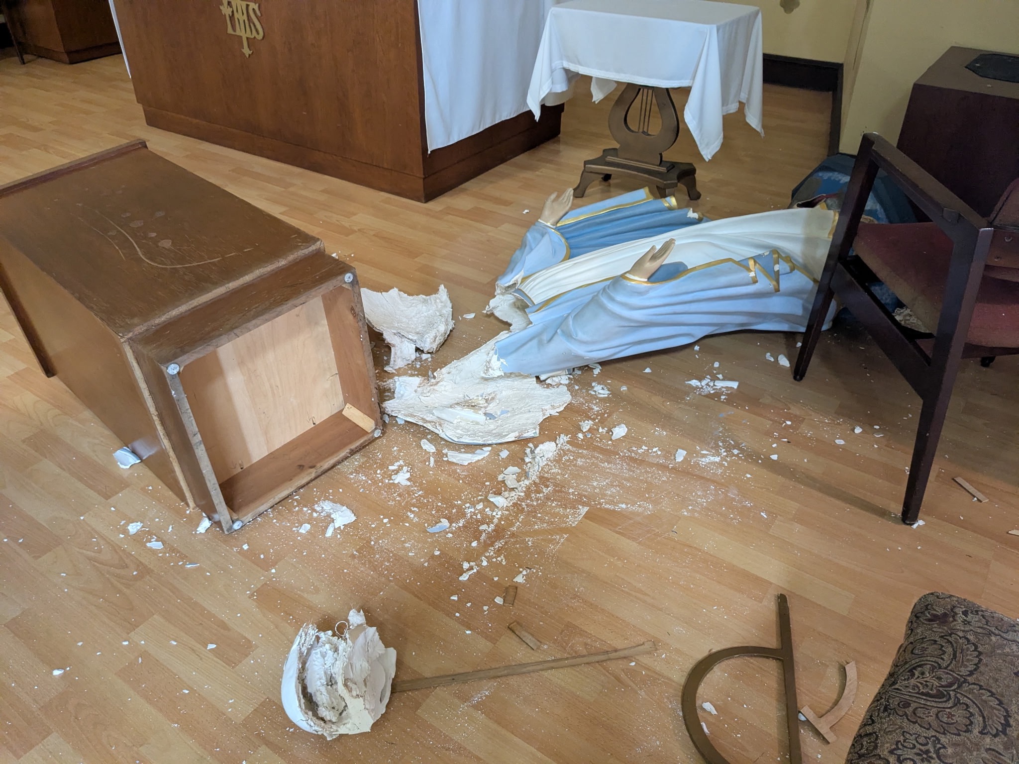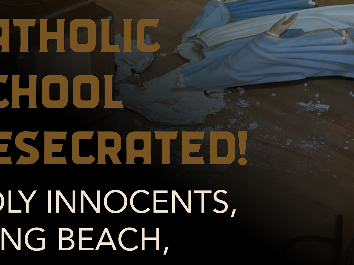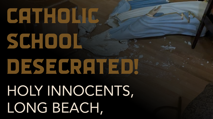 This morning Staff at Holy innocents Catholic School in Long Beach, CA arrived to discover the school assembly hall, chapel, and classrooms had been broken into and desecrated. What appears to have been multiple perpetrators smashed statues and ruined images of our Lady, other statues as well, and threw the tabernacle down. A call was made at 7:00 AM local time to Law Enforcement who have yet to arrive at the time of this post. The FBI was also contacted. The Bishop is on site now with the staff assessing the situation as they wait for law enforcement. Bishop, Mark Trudeau said that it is the worst case of vandalism that he's ever seen in the region.
