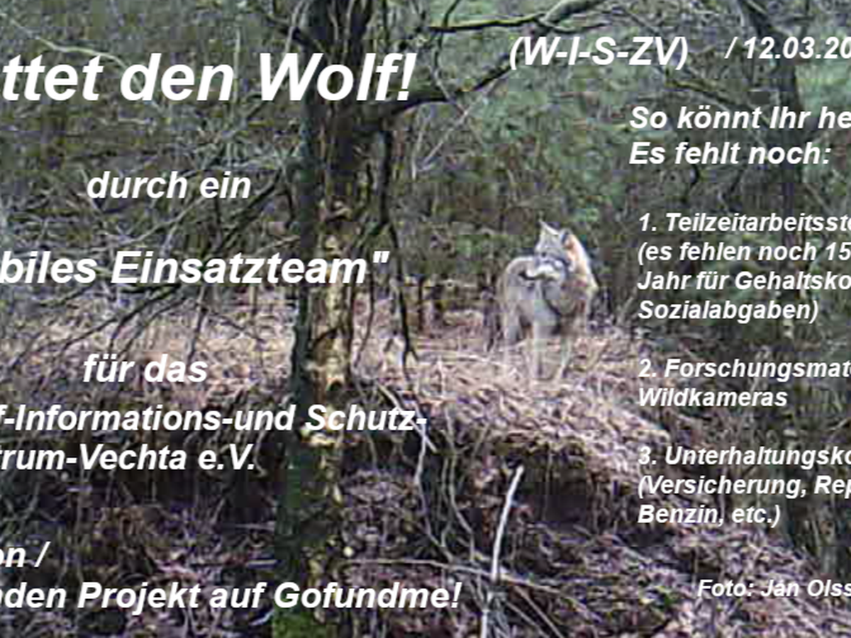 Mit Eurer Hilfe können wir nun ein „Mobiles Einsatzteam“ weiterhin mit professioneller Ausrüstung gemäß unserer Satzung (W-I-S-Z-V) aufstellen, um die Kriminellen, die Wölfe illegal quälen und umbringen, in Zusammenarbeit mit den zuständigen Stellen, besser und effektiver überführen zu können!