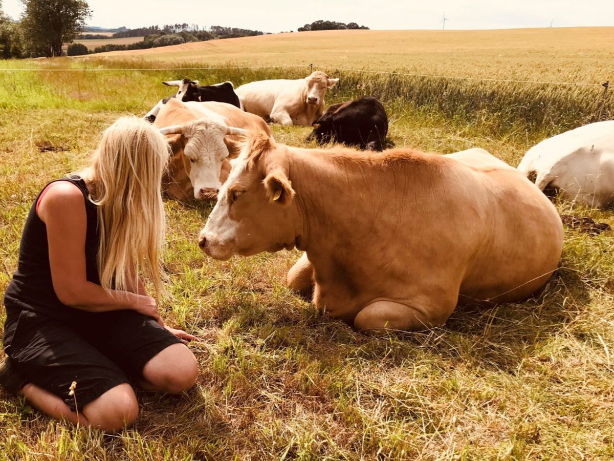 Nun sind 5 Jahre vergangen und diese Kuh, mit Namen Bella, steht auf einer der Weiden Nähe Döbeln mit anderen Rindern in unserer Glücksherde zusammen. Die Herde hat eine großartige positive Dynamik. Wenn Conny nach ihnen ruft, galoppieren sie in ihre Richtung. Meist gibt es Möhren oder Salate aber auch die geliebten Streicheleinheiten dürfen nicht fehlen. Seit 2015 hat sie zusammen mit anderen Tierschützern 16 weitere Rinder und auch Schafe, Ziegen und Schweine vor der Schlachtung gerettet.