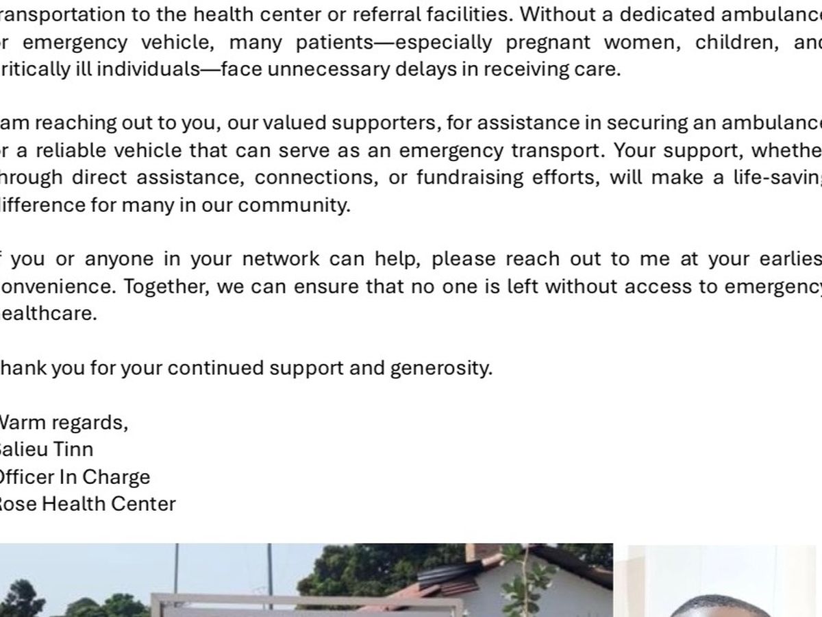 Hallo, mein Name ist Markus Ammann, Rechtsanwalt aus Lindenberg und Oberstaufen. Im März 2024 habe ich in Gambia Herrn Salieu Tinn, Manager des Rose Health Centers in Buniadu am Nordufer des Gambia River kennen gelernt und als Freund gewonnen. Seitdem unterstützen meine Frau Dr. Surina Zakikhani, Gastroenterologin in Immenstadt, das Health Center nach Kräften mit medizinischem Material. Soeben erreichte mich der in die Fotos eingestellte Hilferuf Salieus: