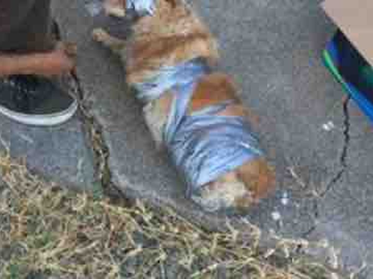 Revas splint had been removed and Nate had been caught red handed duct taping her entire body including her eyes, ears and bridge of her nose. She had no way to move. The dogsitters brother had the sense to immediately snap a pic of Reva and got all of the dogs out of the house.