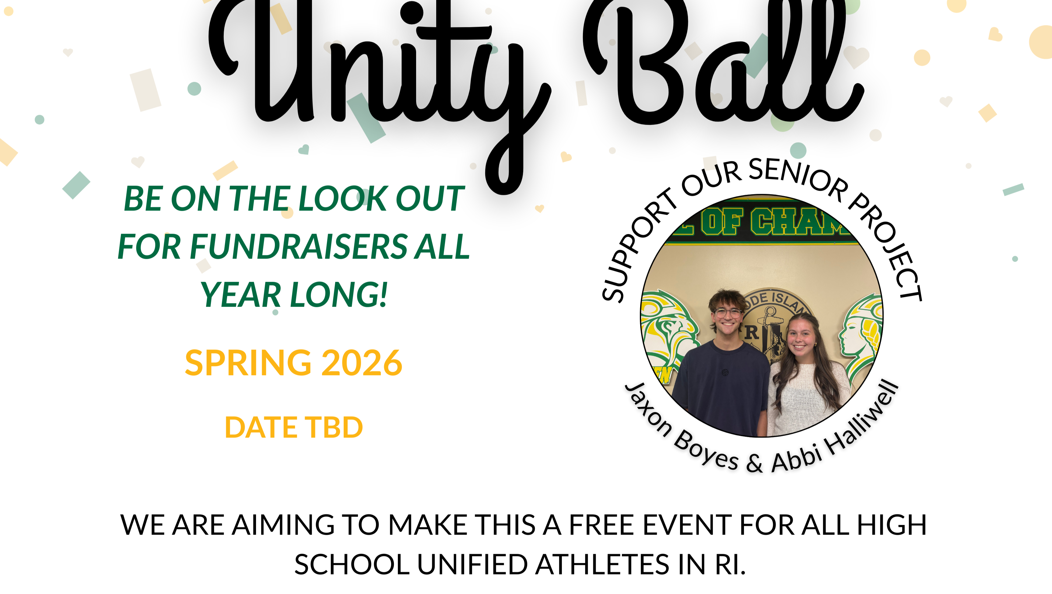 Hi I’m Jaxon Boyes and I’m Abbigail Halliwell. We are seniors at North Smithfield High School and have chosen to host the 2025-26 Unity Ball for Unified Athletes and coaches. We aim to make this a completely free event for all those invited, but in order for that to happen we need your help!! Along with this go-fund me we will be hosting fundraisers all over the State of Rhode Island to reach not only our financial goal but also to make this a memorable event!! We appreciate any and all donations, a little goes a long way!!