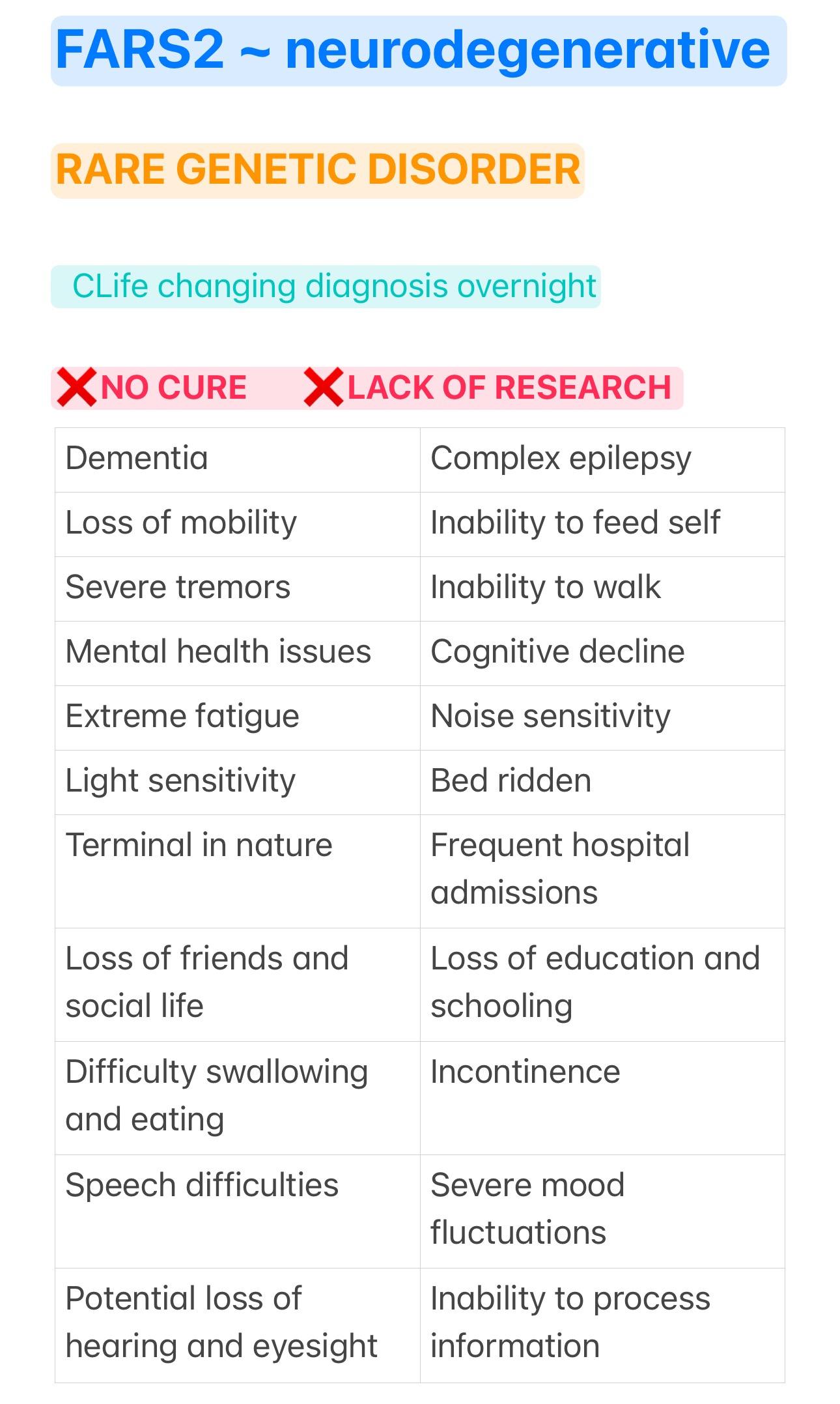 My daughter recently passed away from an extremely rare genetic disorder called FARS2 Mitochondrial disease. (Rihanna is the first case in Australia).