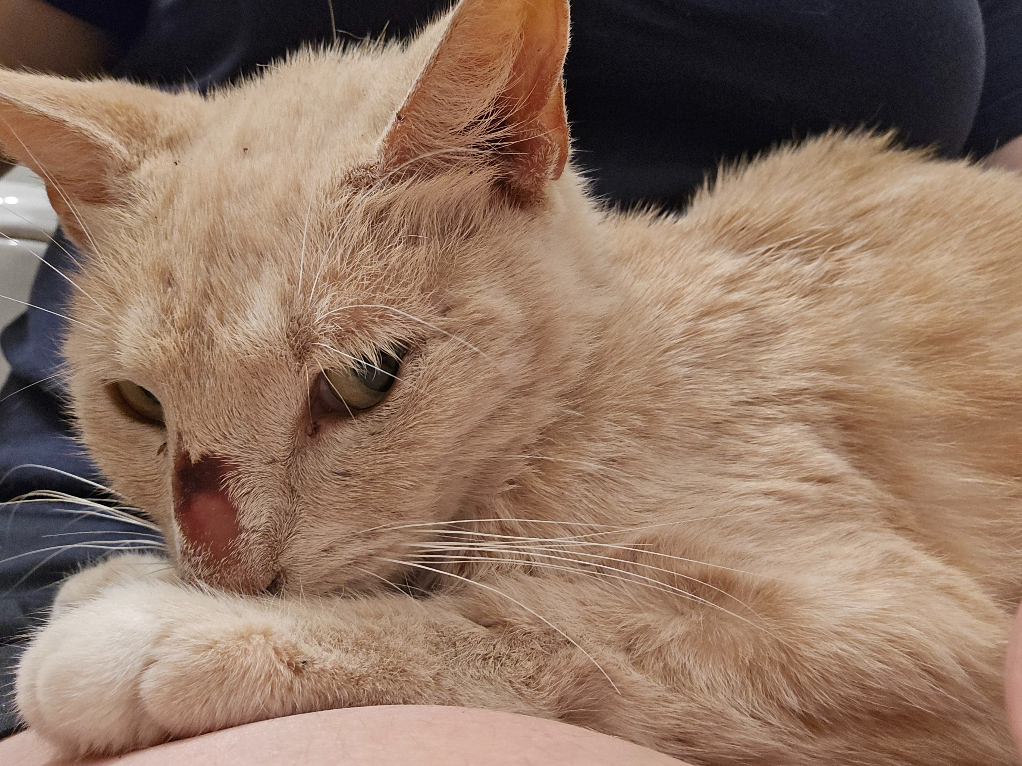 When we got her, she was near death, covered in ticks, and completely emaciated. She's had a miscarriage since we brought her home. She's FIV+ and we recently discovered she's battling FIP. She was very obviously someone's pet at some point, and many of these issues are the direct result of her previous owners not getting her fixed. It's unimaginable what she's been through since she was abandoned on the highway by her people.