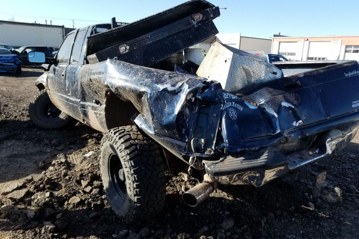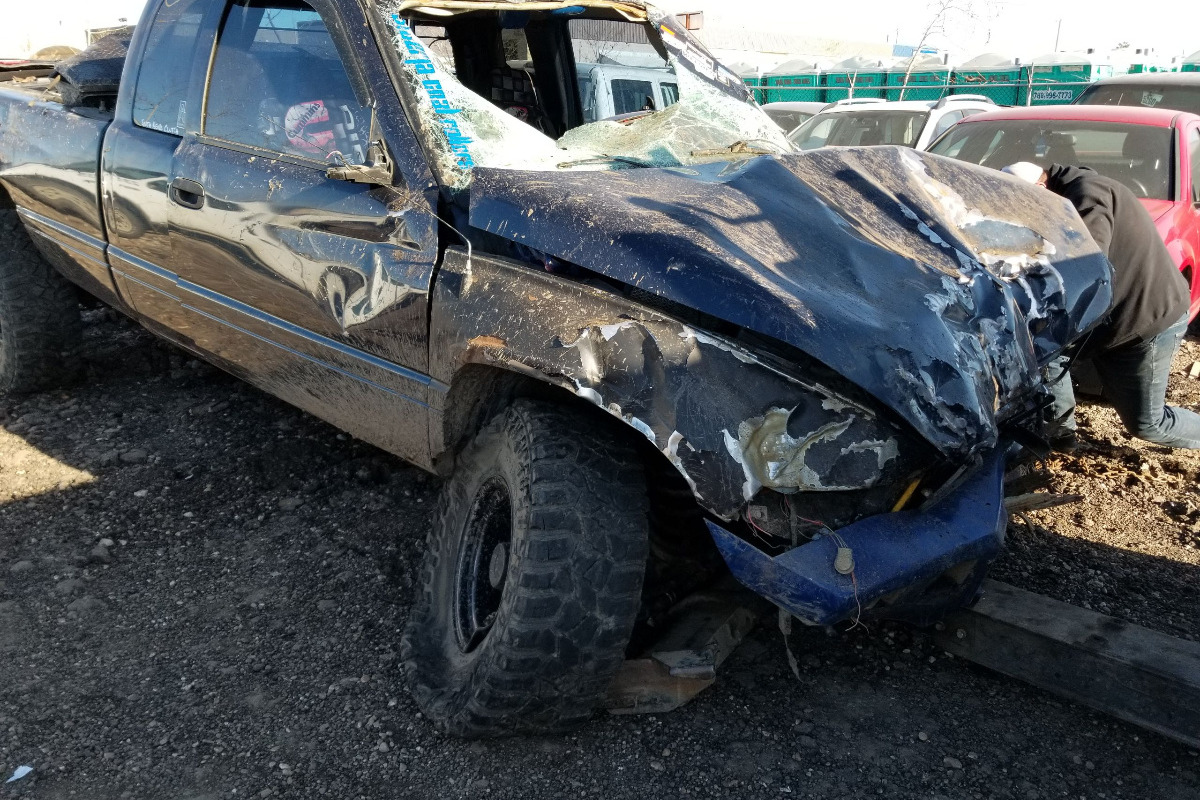 this is what Roberts truck looked like after the accident ,the dent in the roof is where his head hit the visor ,he is extremely lucky to be alive ,