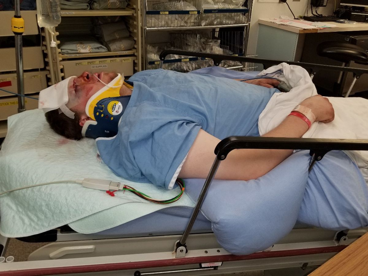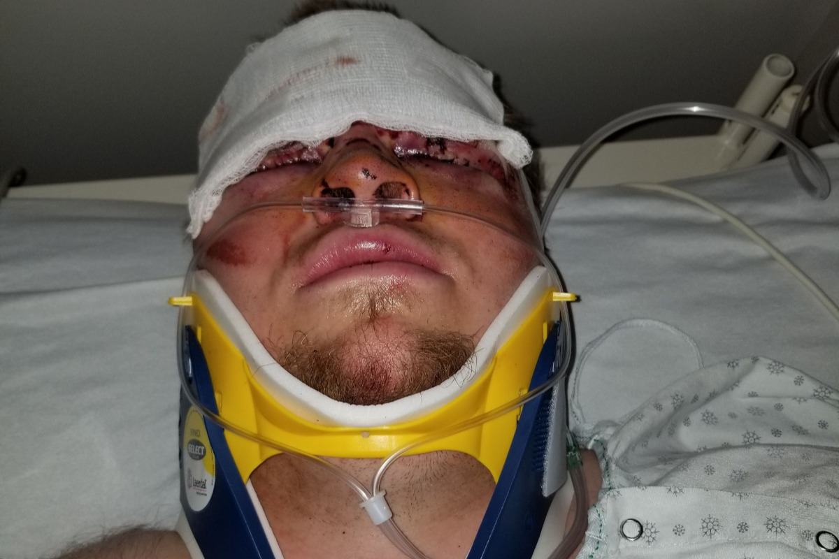 This is my son Robert Klein , Robert was on his way home at 3 am when he swerved to avoid hitting a moose in the middle of the highway  he swerved onto the shoulder and was launched airborne by the ditch his truck launched and flew almost 100 ft clearing the stop sign ,and landing nose first into a fence and some trees the truck flipped over end over end landing on its tailgate and finally landing on its wheels, the occupants of the vehicle were both ejected out of the vehicle as were the 3 dogs in the back seat. Robert struggled up to the road using a shovel as a crutch to wave down some help , the first car aimed directly at him and ended up driving over his foot since Robert was not able to jump out of the way. the second car stopped and called for assistance .Roberts injuries are a dislocated ankle ,broken leg  ,broken rib's , broken T3 in his back, broken cheek bones, upper jaw,and lots of pulled ligaments in his neck . he is looking at several operations to repair the bones in his face ,