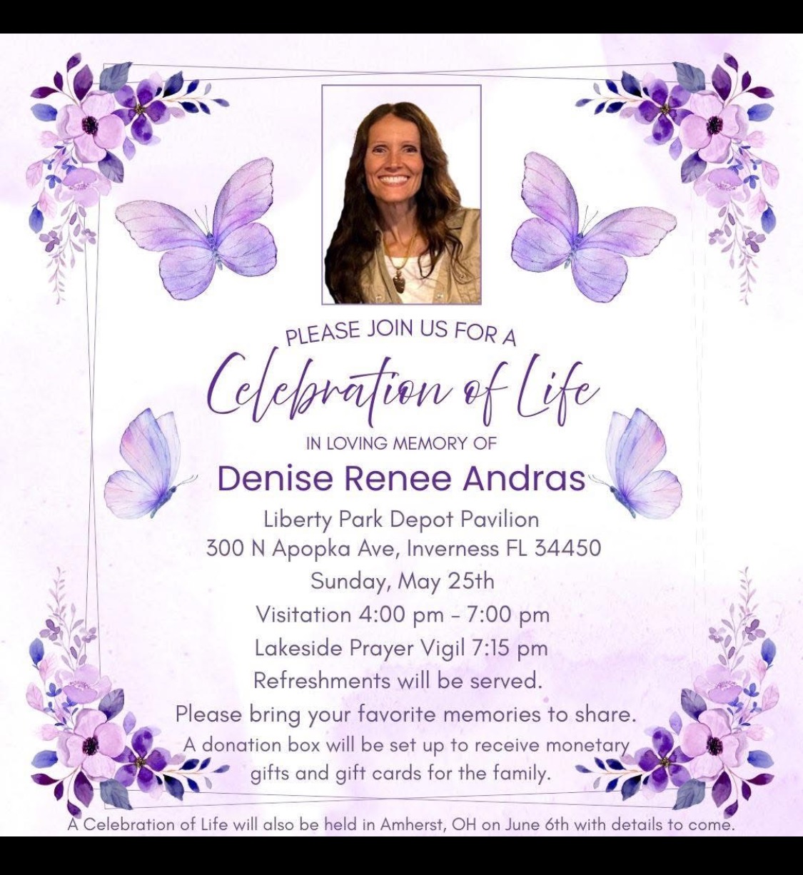 Inverness, FL, to the Andras Family, is a “small town, done right”, a place Denise thought of as “home, heaven on earth, her adventure base, her happy place with her family” - will forever feel the outward ripples of how Denise embraced the community by blessing everyone she met with unending waves of kindness, generosity, sweetness, joy, and an instant feeling of belonging - because of how she welcomed everyone into her circle and wanted people to feel included and loved.