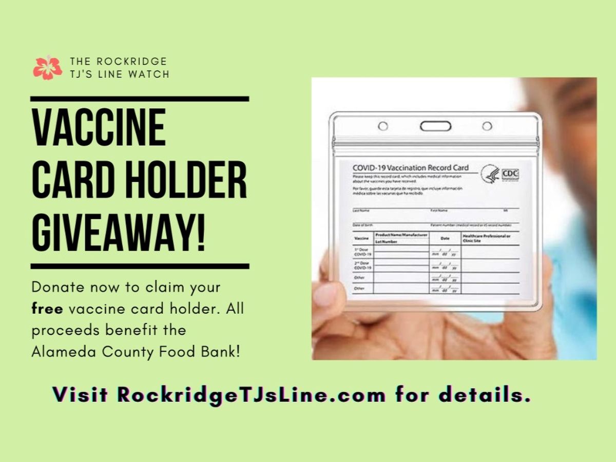 The Rockridge TJ’s Line Watch is ending May 31, 2021. To say thanks for everyone’s support over this past year, we are giving away FREE vaccine card holders for every $5 donated until we reach our final goal of $10,000.
