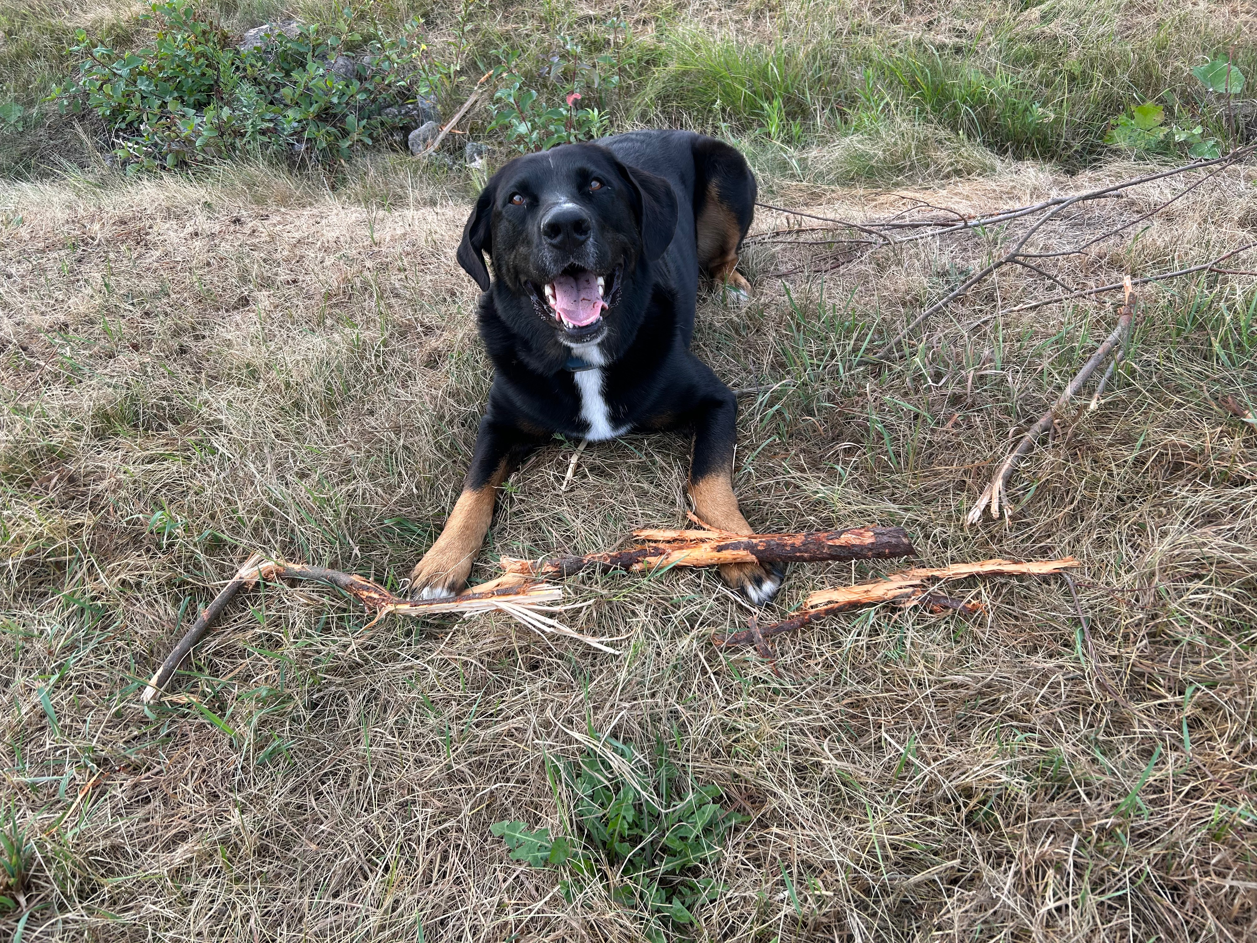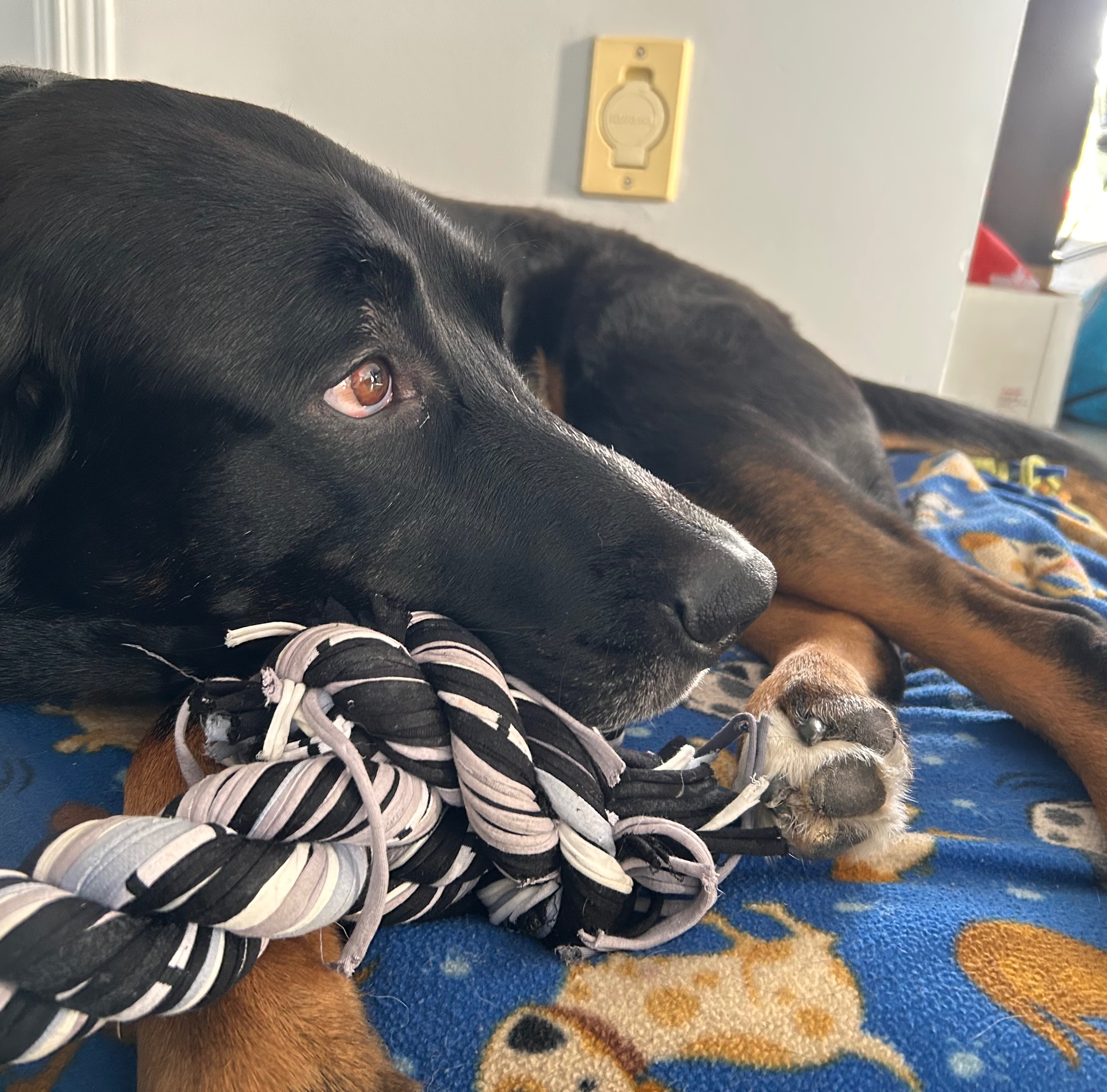 Depuis 6 semaines Rocky boite. Déchirure du ligament croisé droit. La solution : anti inflammatoire à vie. Il met tout son poids à gauche. Finalement le ligament croisé gauche déchire aussi. Il l'avait blessé il y a un an, mais nous l'ignorions du à un mauvais diagnostic. On s'était fait dire une dysplasie de la hanche qu'on s'attendait à soigner avec des injections lorsqu'il serait plus vieux. Avoir su il y a un an la vrai raison de sa boiterie, nous aurions pu intervenir plus rapidement et, peut-être, pu éviter une rupture de l'autre ligament.