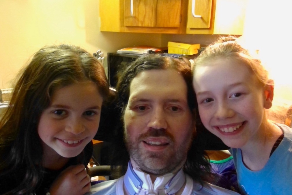 Here are a few updates on his progression from this devil of a disease: We are delighted that Rob can now communicate better with the help of technology donated to him, but his speech is slurred now and it’s hard to communicate the “old-fashioned way”. Hard is an understatement. He now types with his eyes, yes, his eyes. Rob loves going outside in the sun when he can, in his wheel chair. Most people ask what he can do now. We say he can’t do too much. He can’t walk, he can’t move his arms, legs, fingers, hug or squeeze his kids, and the list goes on. What we say he CAN do is still joke and laugh. For that, we are happy. Each smile he gives is an indication that he, too, has hope for the future and for this treatment.