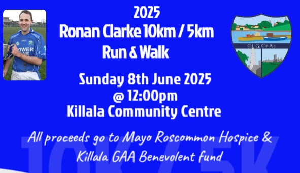 We are delighted to welcome everyone back to Killala to partake in the 11th annual Ronan Clarke 5K/10K Run/Walk for 2025.