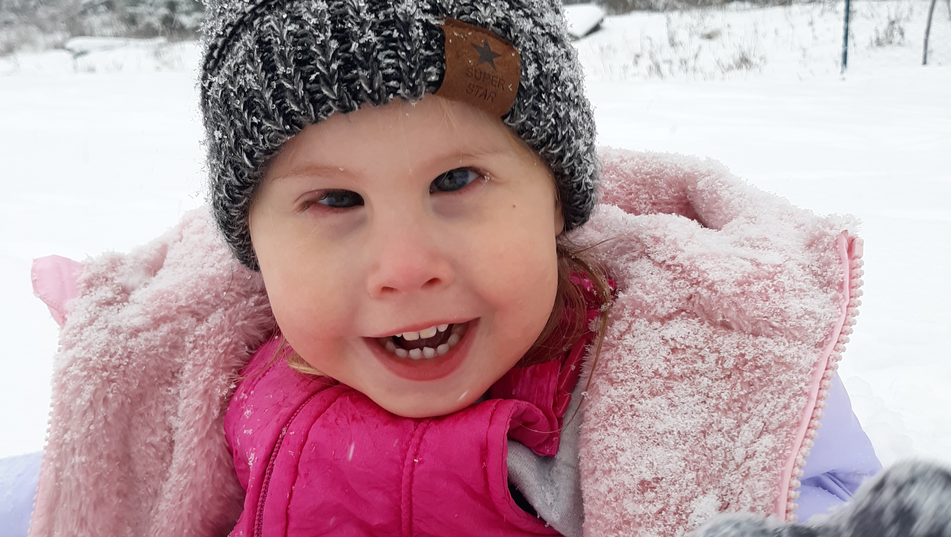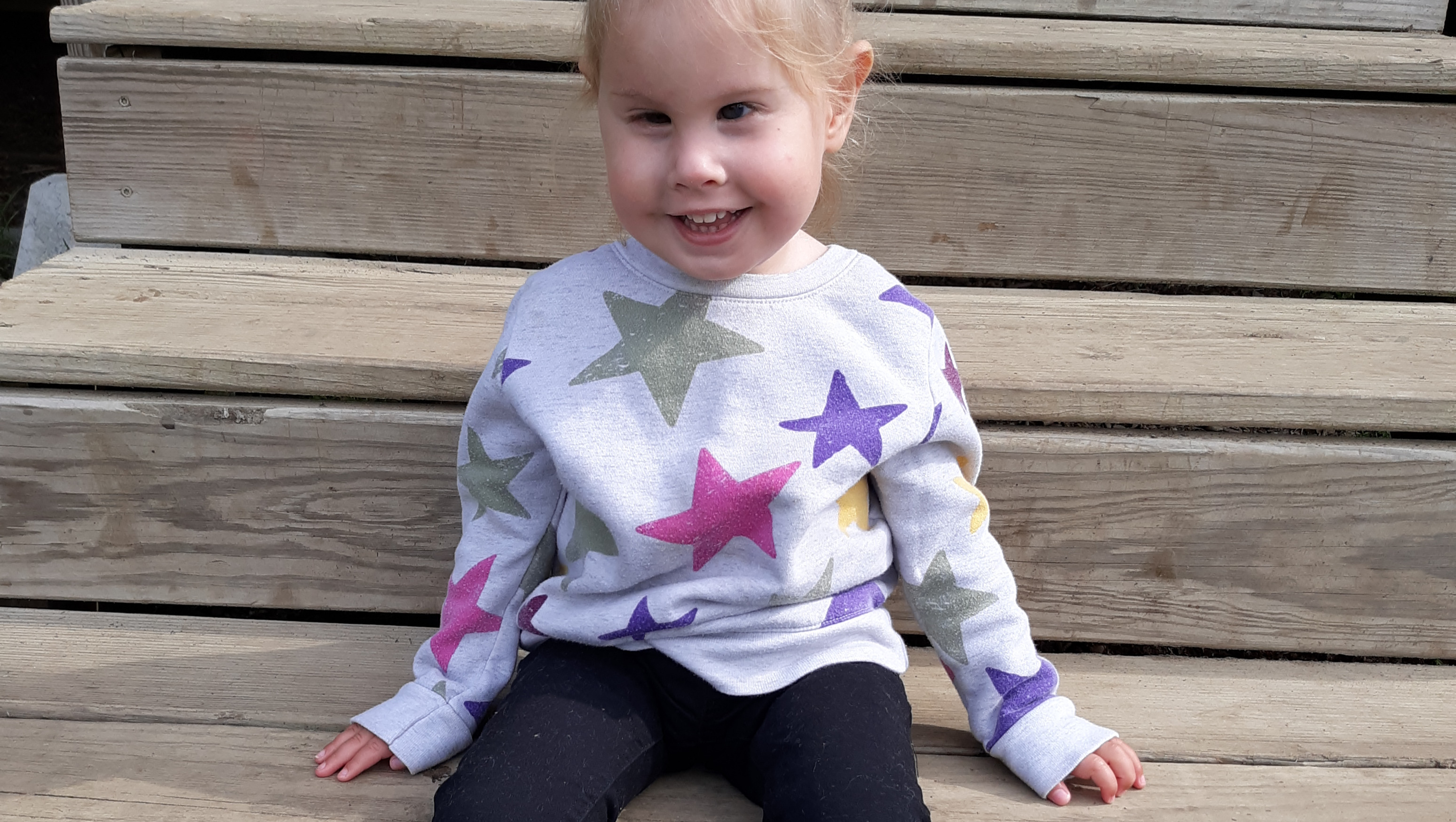 Emery is a sweet and extremely happy three-year-old little girl. She loves bubbles, car rides, reading books, splashing water out of the bathtub, laughing at her homestead animals, feeding the dog, interacting with her friends at gym class, anything that involves swinging or bouncing, meeting new people (especially at the grocery store), snuggles with her mama, and dancing with her dada! Emery spends most of her time playing at home, doing preschool, going to her twice weekly speech and occupational therapy sessions, and getting together with friends for playdates.