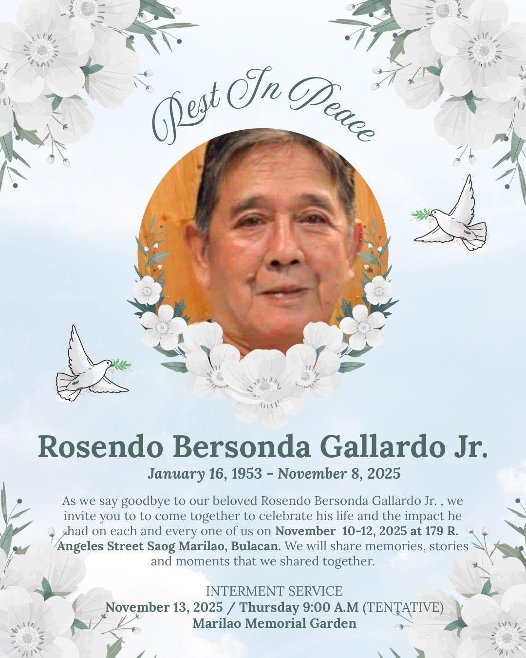 It is with immense sadness that I share the news of the sudden passing of my beloved father, Rosendo B. Gallardo Jr.