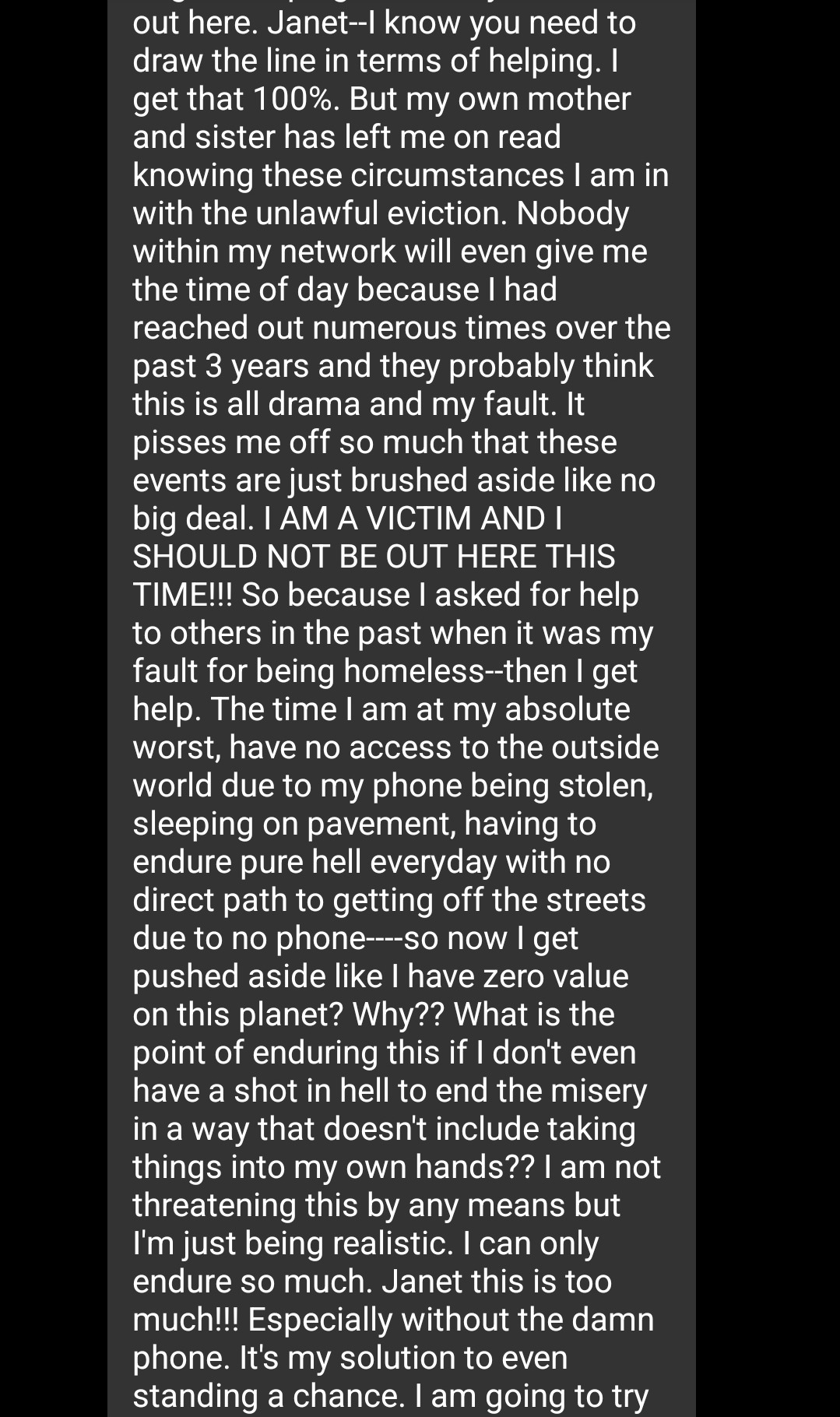 Finally 2025 things were looking up. A tiny apartment and a new job. Nope.. Ross was assaulted and lost both. He eventually spent time in a facility and received therapy and care, and was discharged to a shared home and new job. Nope.. a corrupt policeman kicked him out on the street again, and 200 phone calls gained him no help or support. Now he sleeps on concrete and begs for food. And his phone was stolen.