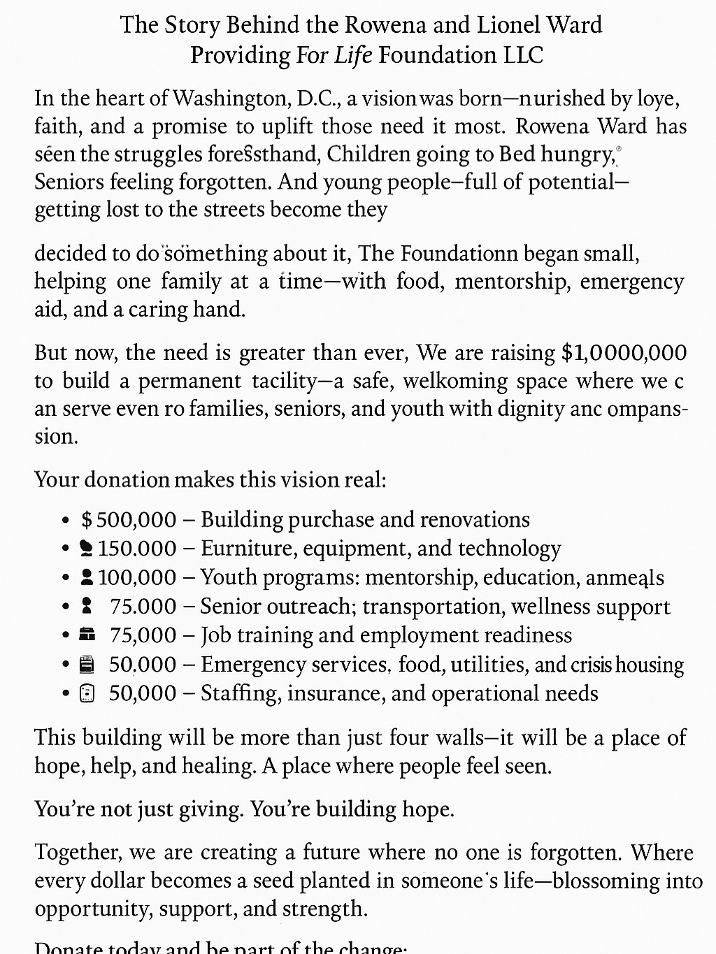 But now, the need is greater than ever, We are raising $1,0000,000 to build a permanent tacility-a safe, welkoming space where we c an serve even ro families, seniors, and youth with dignity anc ompans-sion.