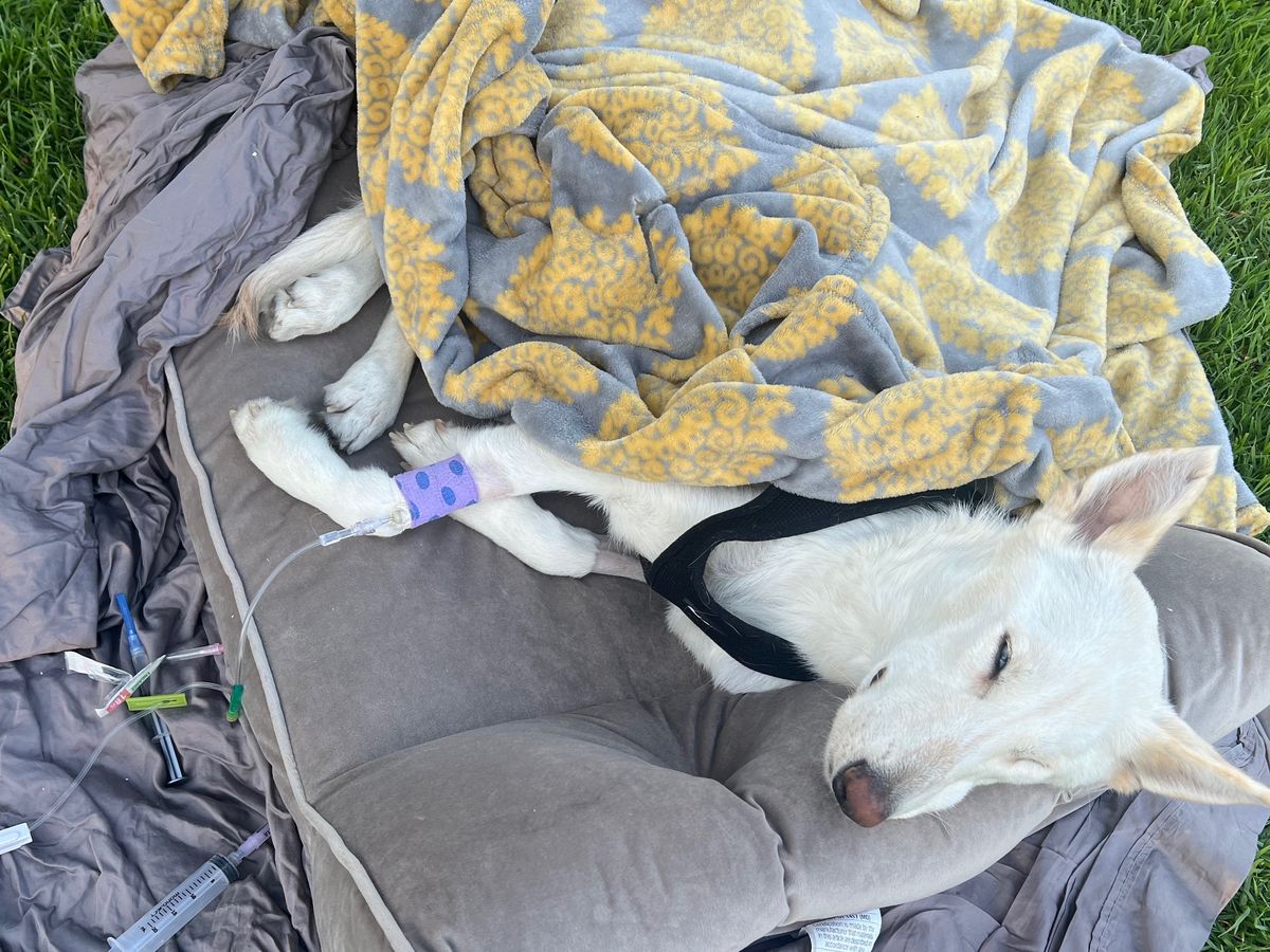 short version - she was brought in after recently giving birth to puppies but no puppies came with we are just finding out ) she was malnourished at only 30 lbs ( for a husky and Sheppard ) gravely underweight , amemic, malnourished, terrified and sleeping on a cold hard floor there she was placed on the Euthanize list and became sick at the shelter . A rescue pulled her out and brought her to us . We had no idea she was this sick and now she is fighting for her life .